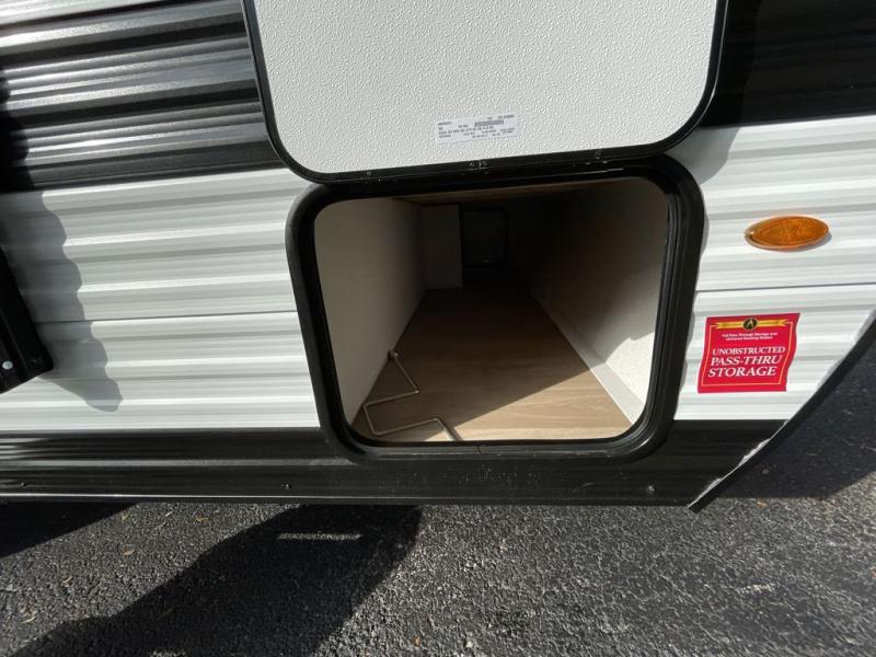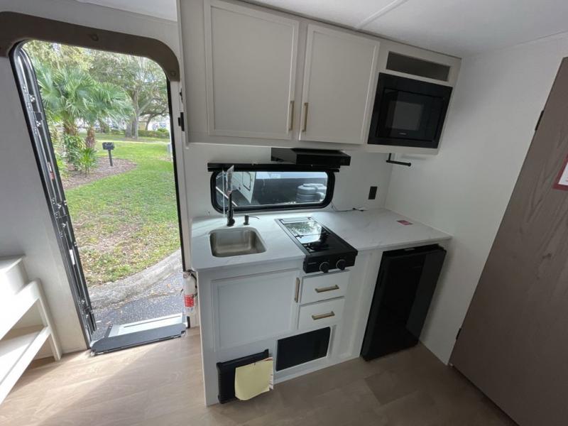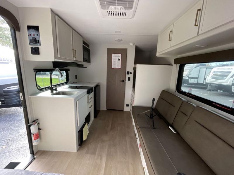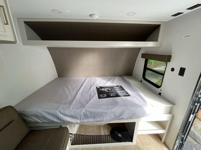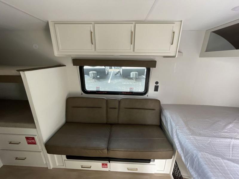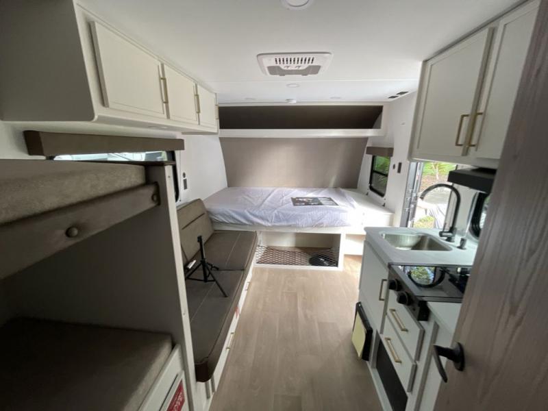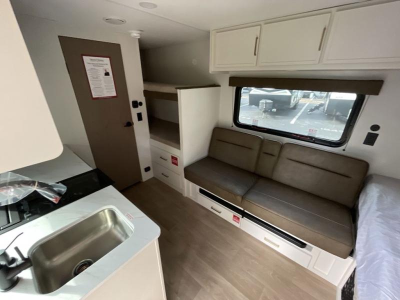 Camping trips to the lake have never been easier than with this travel trailer! The 28" x 67" bunks are right next to the private bath for easy nighttime use, and the front queen bed includes hidden storage for your things. There is also a 66" Jack knife sofa that provides a little more sleeping space for guests. A kitchen lets you cook meals each day and there is an exterior LP quick connect if you want to fire up your own propane grill.