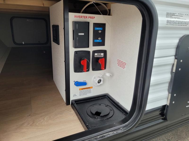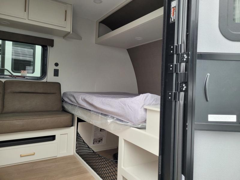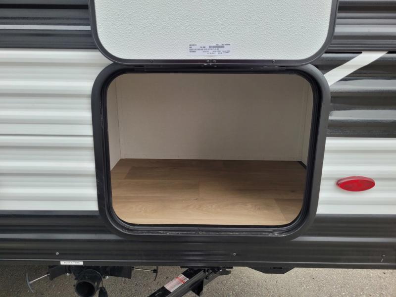 Camping trips to the lake have never been easier than with this travel trailer! The 28" x 67" bunks are right next to the private bath for easy nighttime use, and the front queen bed includes hidden storage for your things. There is also a 66" Jack knife sofa that provides a little more sleeping space for guests. A kitchen lets you cook meals each day and there is an exterior LP quick connect if you want to fire up your own propane grill.