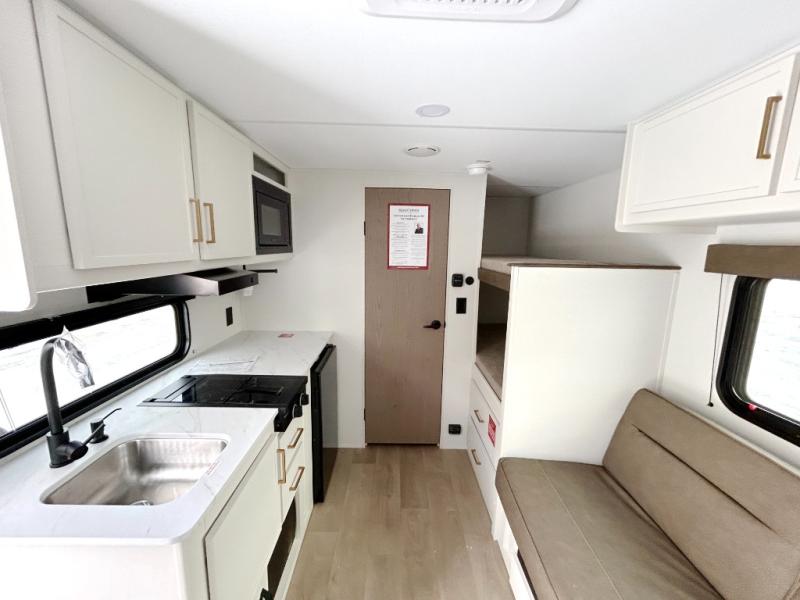 Camping trips to the lake have never been easier than with this travel trailer! The 28" x 67" bunks are right next to the private bath for easy nighttime use, and the front queen bed includes hidden storage for your things. There is also a 66" Jack knife sofa that provides a little more sleeping space for guests. A kitchen lets you cook meals each day and there is an exterior LP quick connect if you want to fire up your own propane grill.