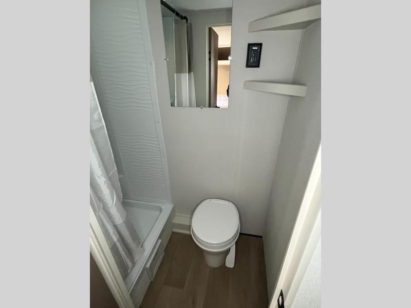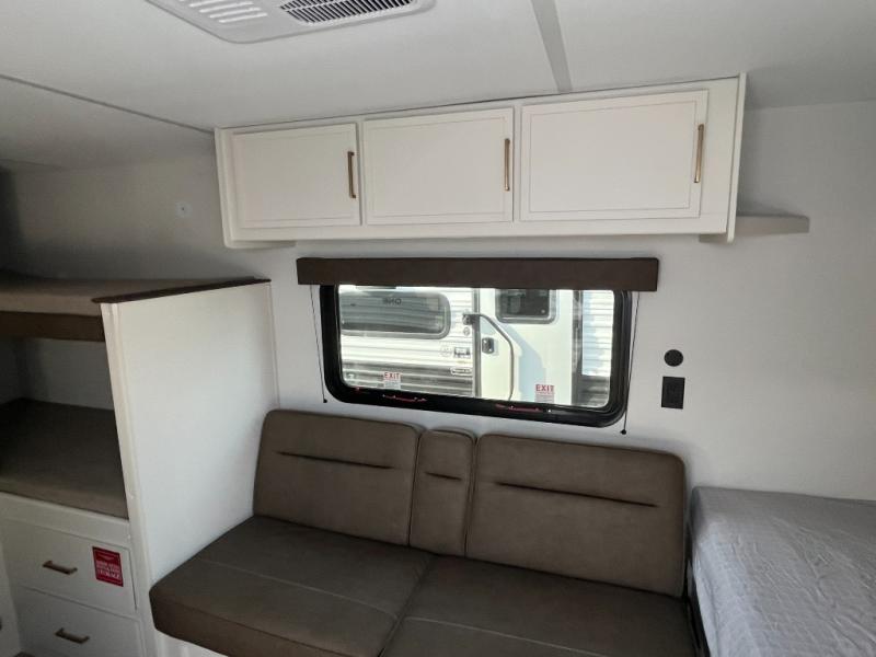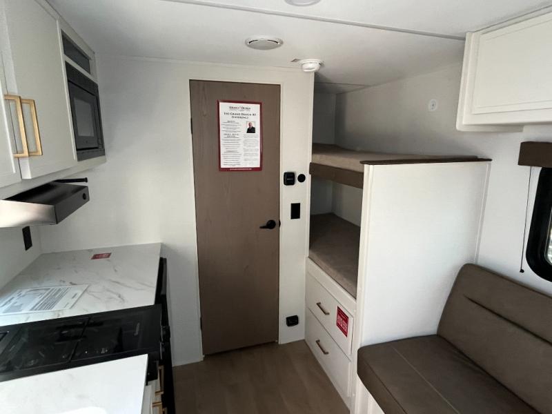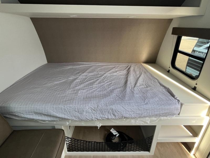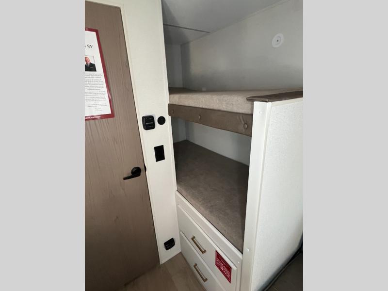 Camping trips to the lake have never been easier than with this travel trailer! The 28" x 67" bunks are right next to the private bath for easy nighttime use, and the front queen bed includes hidden storage for your things. There is also a 66" Jack knife sofa that provides a little more sleeping space for guests. A kitchen lets you cook meals each day and there is an exterior LP quick connect if you want to fire up your own propane grill.