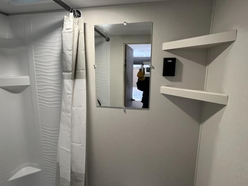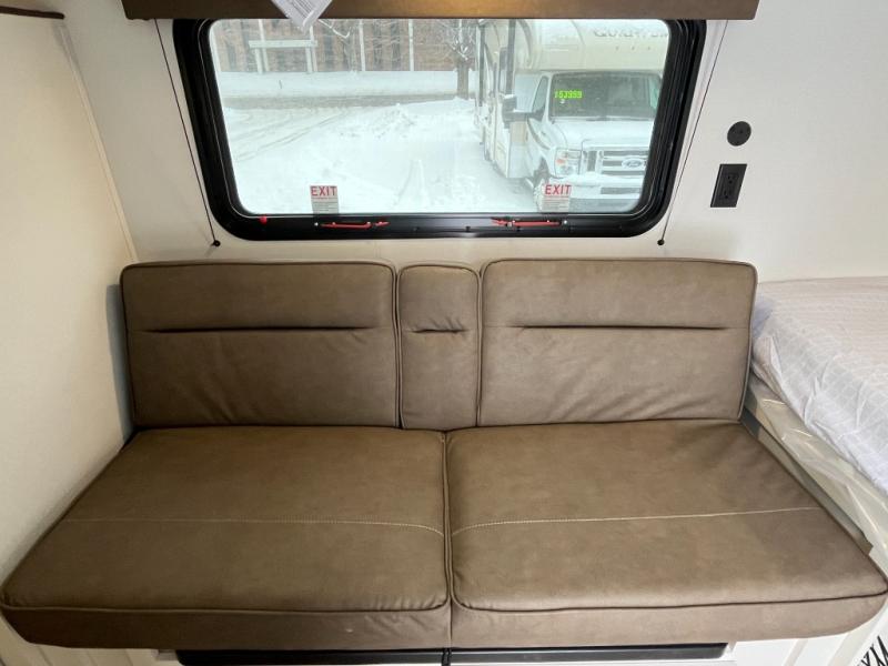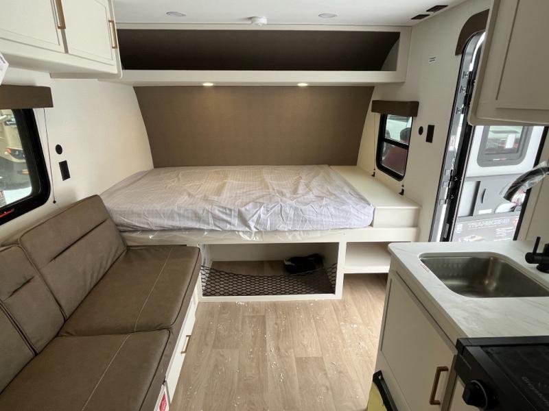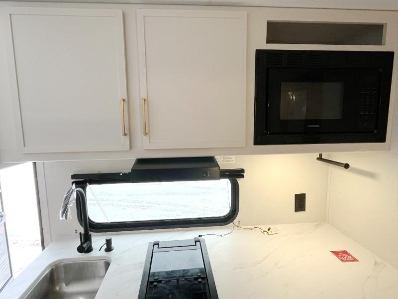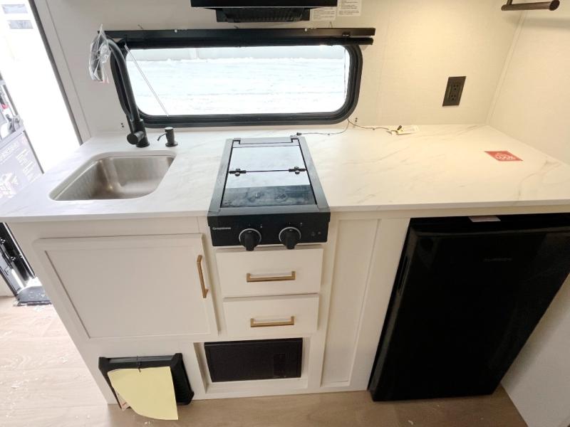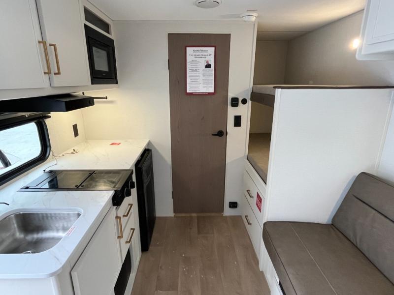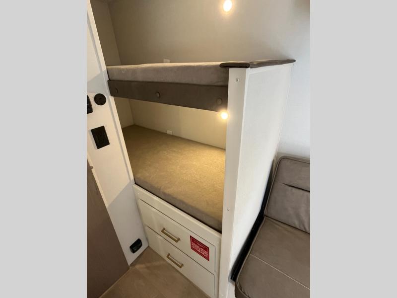 Camping trips to the lake have never been easier than with this travel trailer! The 28" x 67" bunks are right next to the private bath for easy nighttime use, and the front queen bed includes hidden storage for your things. There is also a 66" Jack knife sofa that provides a little more sleeping space for guests. A kitchen lets you cook meals each day and there is an exterior LP quick connect if you want to fire up your own propane grill.