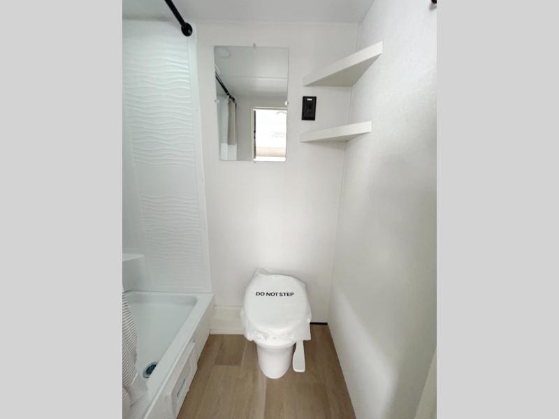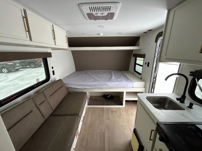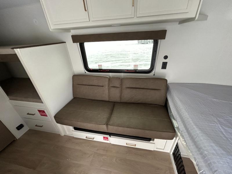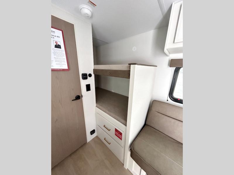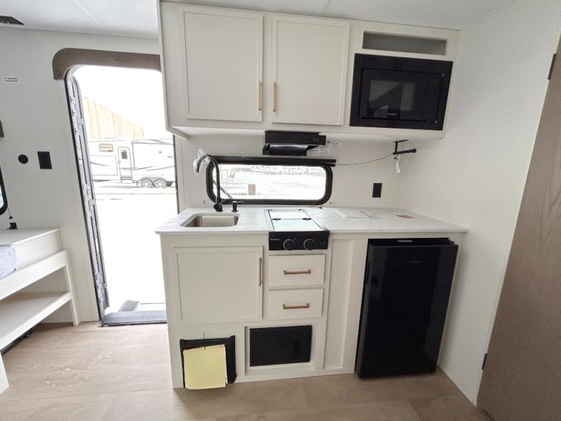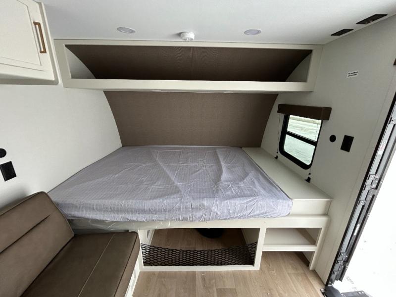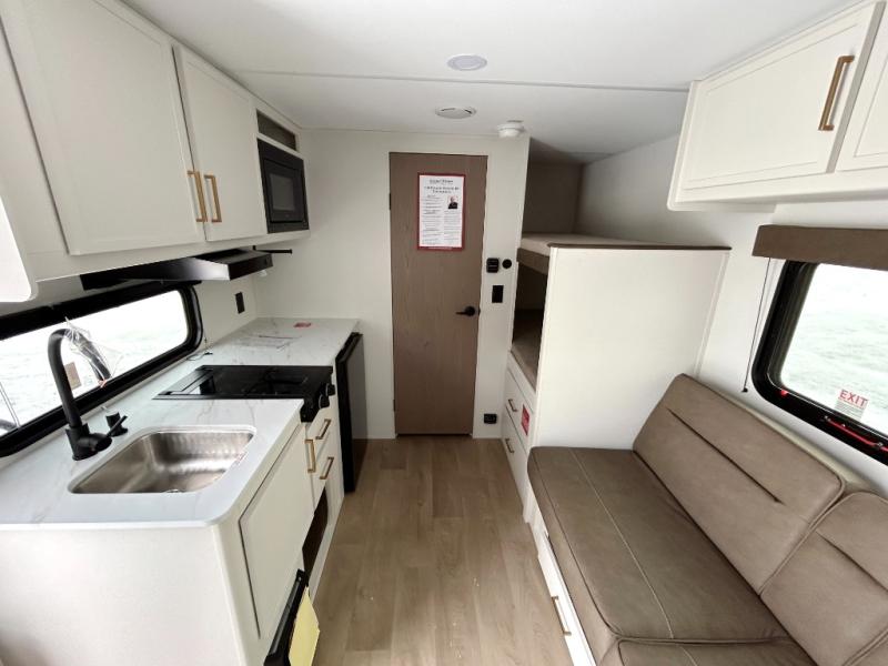 Camping trips to the lake have never been easier than with this travel trailer! The 28" x 67" bunks are right next to the private bath for easy nighttime use, and the front queen bed includes hidden storage for your things. There is also a 66" Jack knife sofa that provides a little more sleeping space for guests. A kitchen lets you cook meals each day and there is an exterior LP quick connect if you want to fire up your own propane grill.