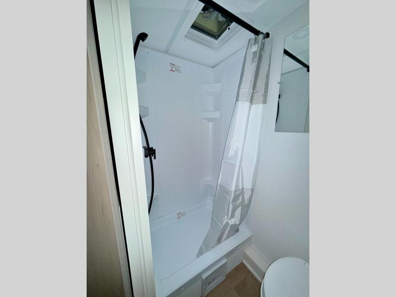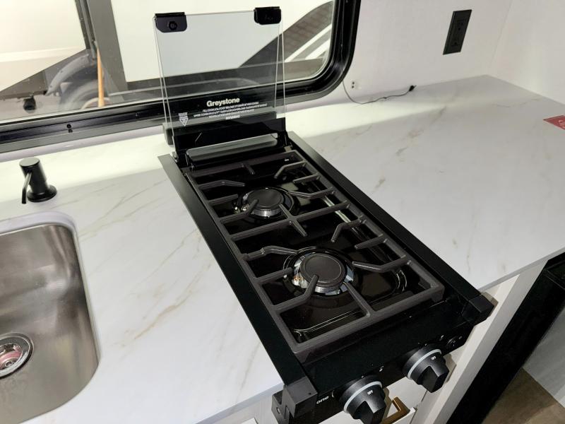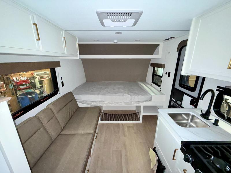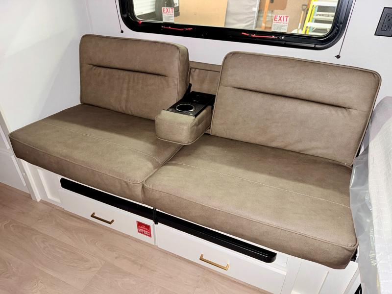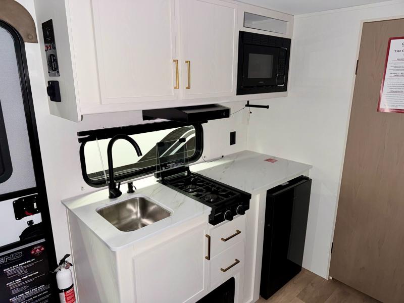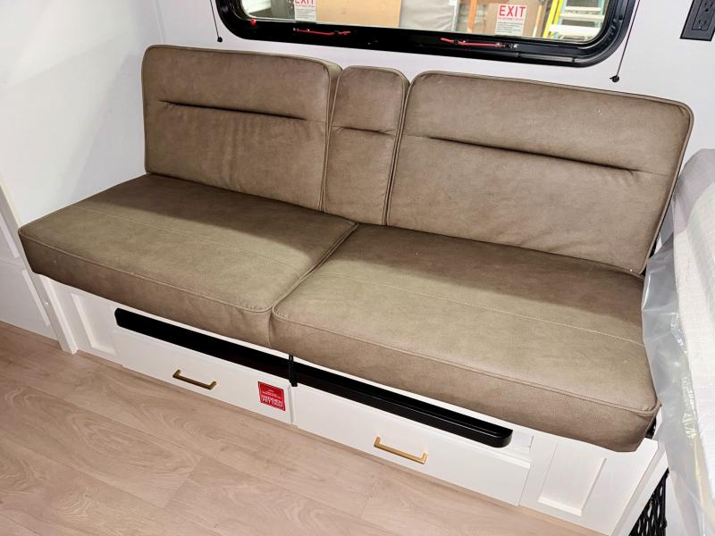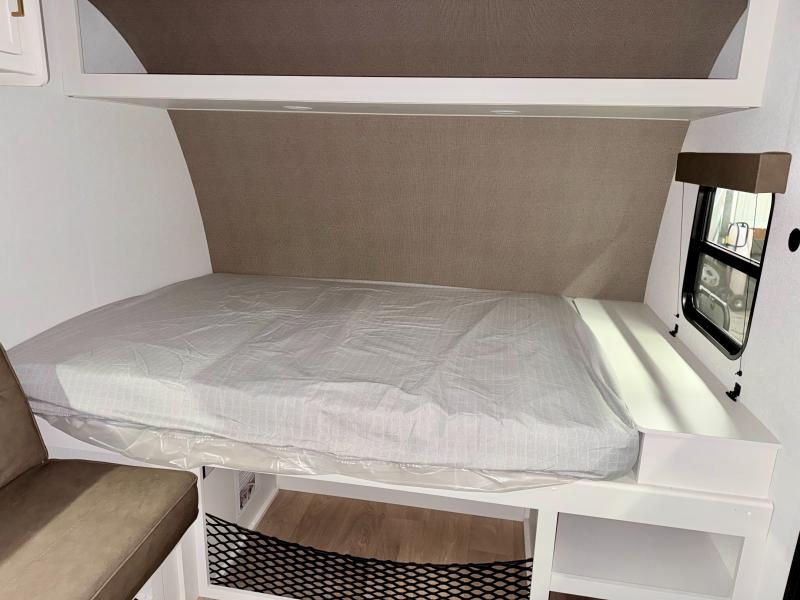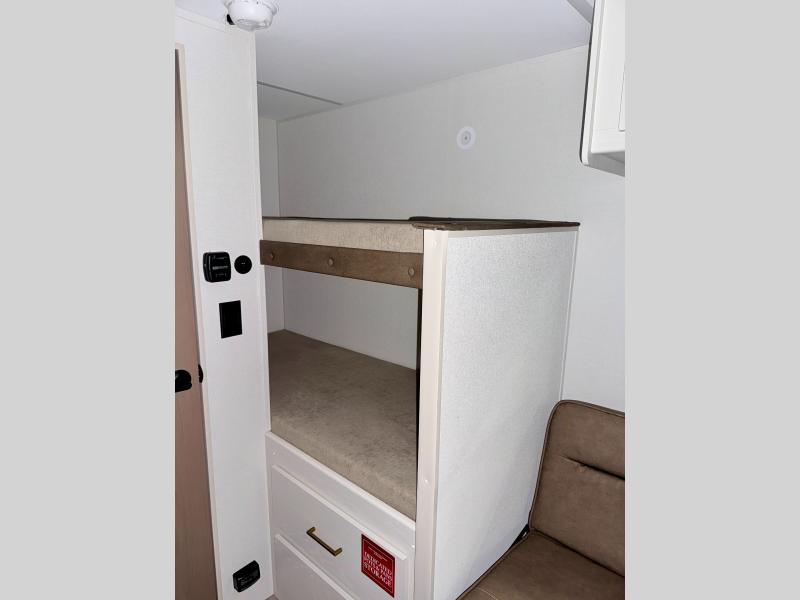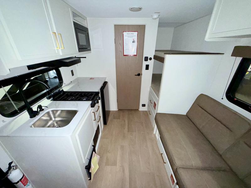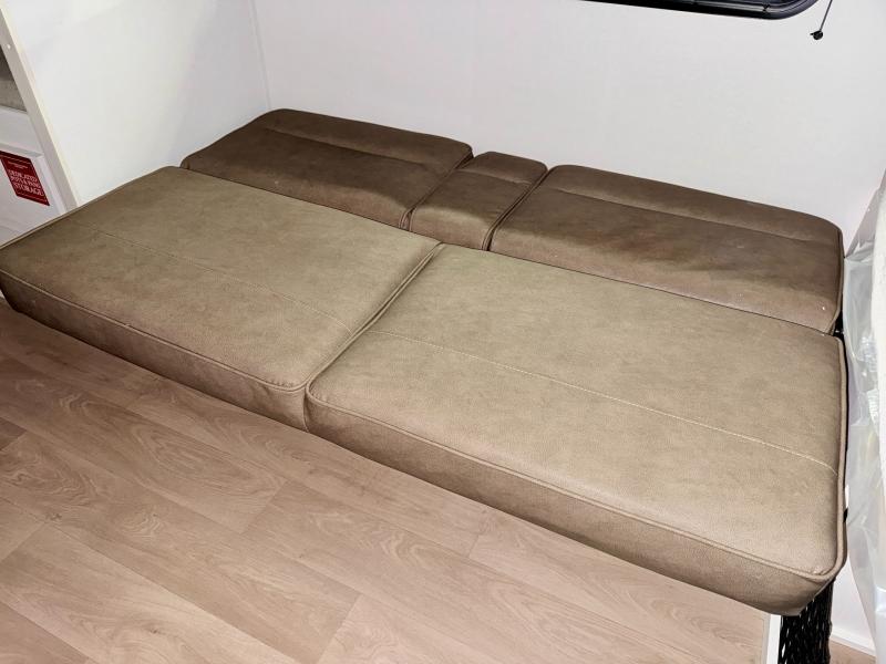 Camping trips to the lake have never been easier than with this travel trailer! The 28" x 67" bunks are right next to the private bath for easy nighttime use, and the front queen bed includes hidden storage for your things. There is also a 66" Jack knife sofa that provides a little more sleeping space for guests. A kitchen lets you cook meals each day and there is an exterior LP quick connect if you want to fire up your own propane grill.