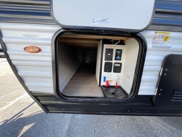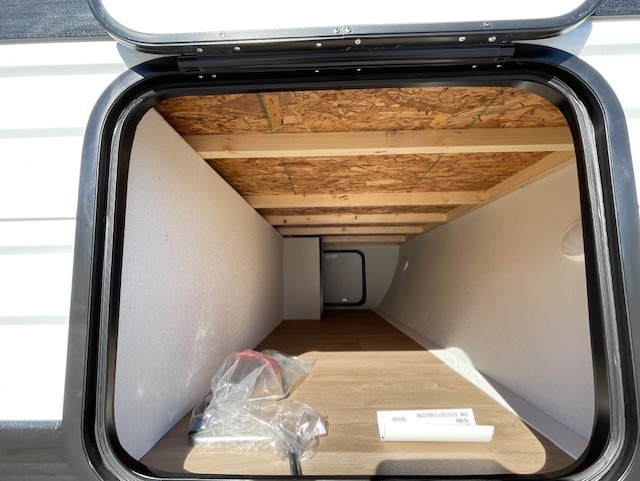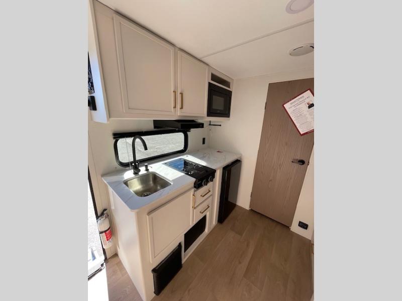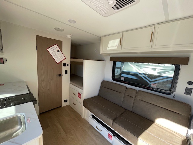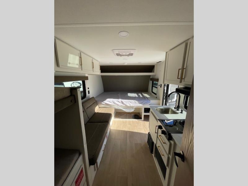 Camping trips to the lake have never been easier than with this travel trailer! The 28" x 67" bunks are right next to the private bath for easy nighttime use, and the front queen bed includes hidden storage for your things. There is also a 66" Jack knife sofa that provides a little more sleeping space for guests. A kitchen lets you cook meals each day and there is an exterior LP quick connect if you want to fire up your own propane grill.