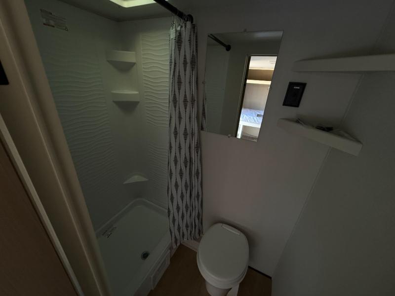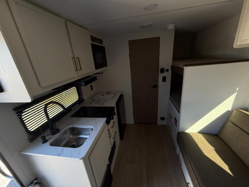 Camping trips to the lake have never been easier than with this travel trailer! The 28" x 67" bunks are right next to the private bath for easy nighttime use, and the front queen bed includes hidden storage for your things. There is also a 66" Jack knife sofa that provides a little more sleeping space for guests. A kitchen lets you cook meals each day and there is an exterior LP quick connect if you want to fire up your own propane grill.