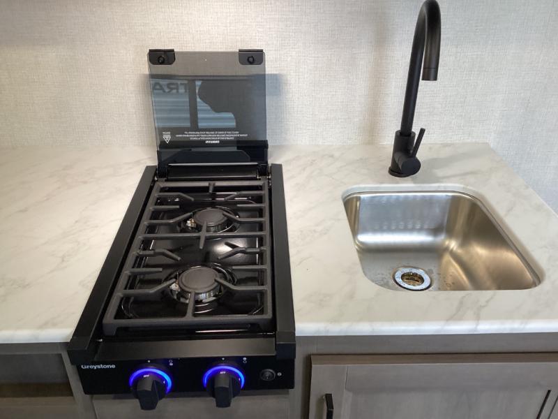 Full-length countertop, deep stainless sink, two-burner range, microwave, and a 12V fridge for easy meal prep. -