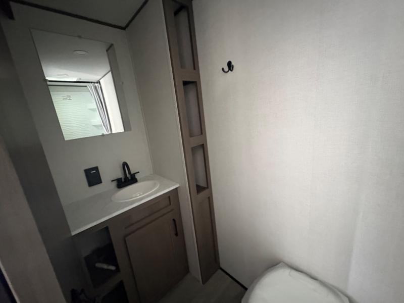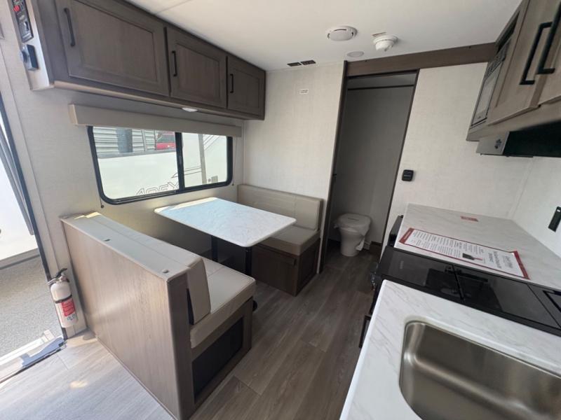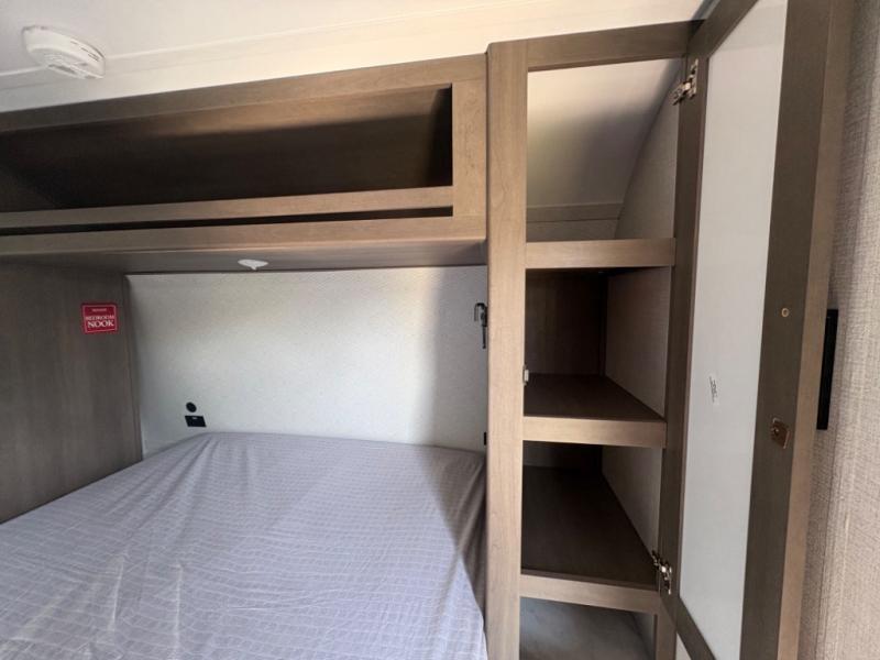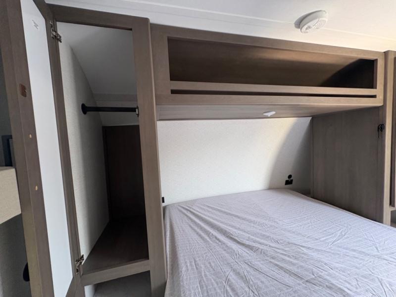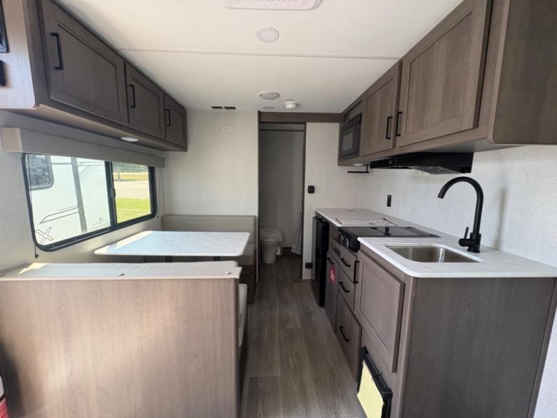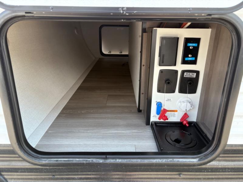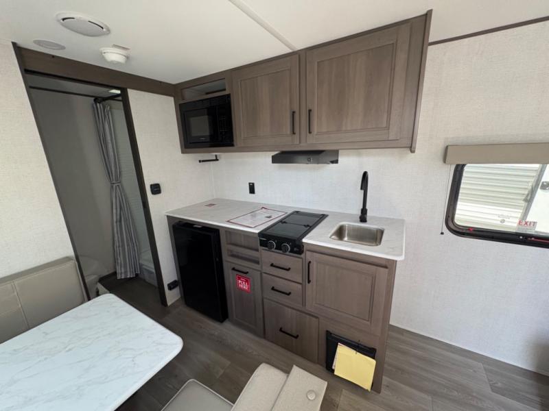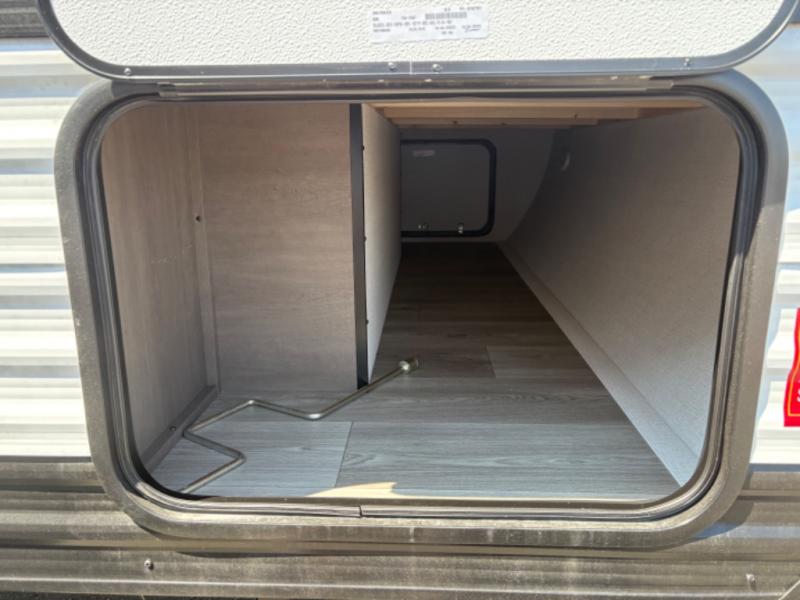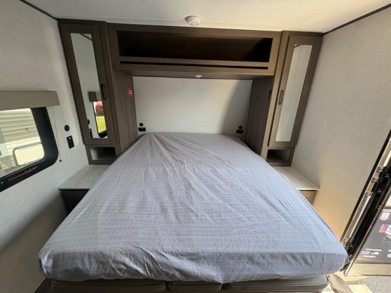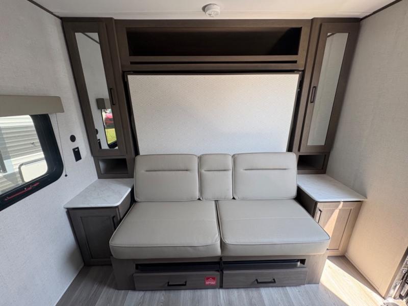 This is the perfect couple's trailer with versatile seating and sleeping space! You'll find a queen-size Murphy bed up front with storage space beside and above plus a full rear bath for added privacy. Once you've made lunch in the full kitchen, you can dine at the booth dinette, or take your plate outdoors to sit under the 10' power awning. You'll also find an unobstructed pass-thru storage outside that will be perfect for fishing poles, lawn chairs, tools and more!