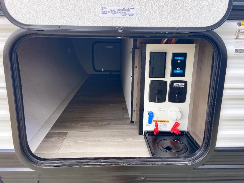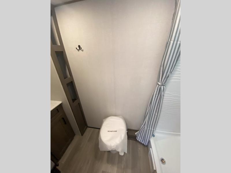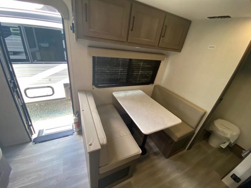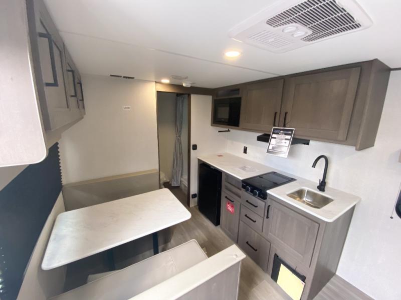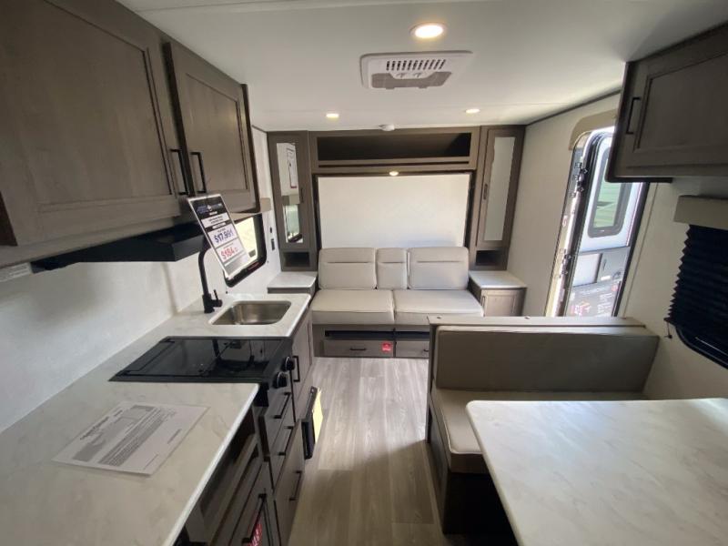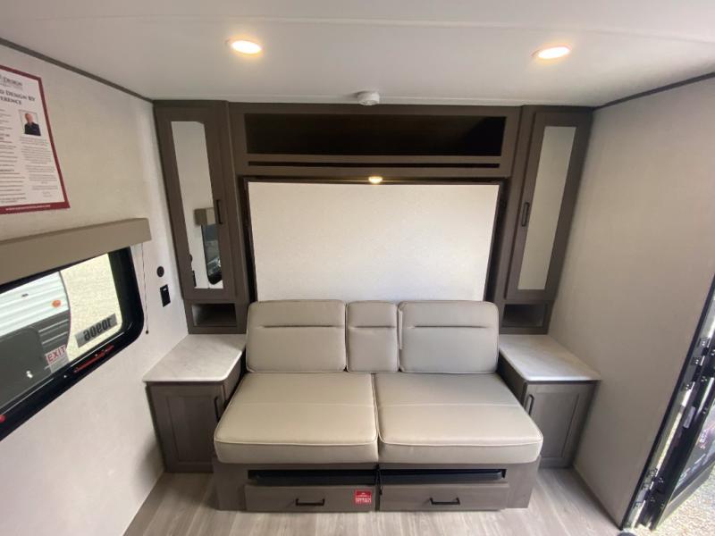 This is the perfect couple's trailer with versatile seating and sleeping space! You'll find a queen-size Murphy bed up front with storage space beside and above plus a full rear bath for added privacy. Once you've made lunch in the full kitchen, you can dine at the booth dinette, or take your plate outdoors to sit under the 10' power awning. You'll also find an unobstructed pass-thru storage outside that will be perfect for fishing poles, lawn chairs, tools and more!