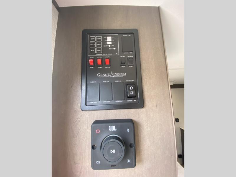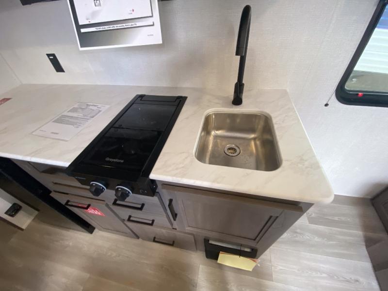 With any Transcend One travel trailer by Grand Design, you will enjoy lightweight towing thanks to their single-axle. There are many interior comforts to make camping easier than ever, such as recessed lighting, residential countertops, and a 6' 6" interior height. Each model is constructed with a heated and enclosed underbelly with suspended tanks, a moisture barrier floor enclosure, and Thermofoil over the roof and front cap for added protection. And a JBL sound system will let you listen to tunes as you visit under the power awning with a Fusion light!
