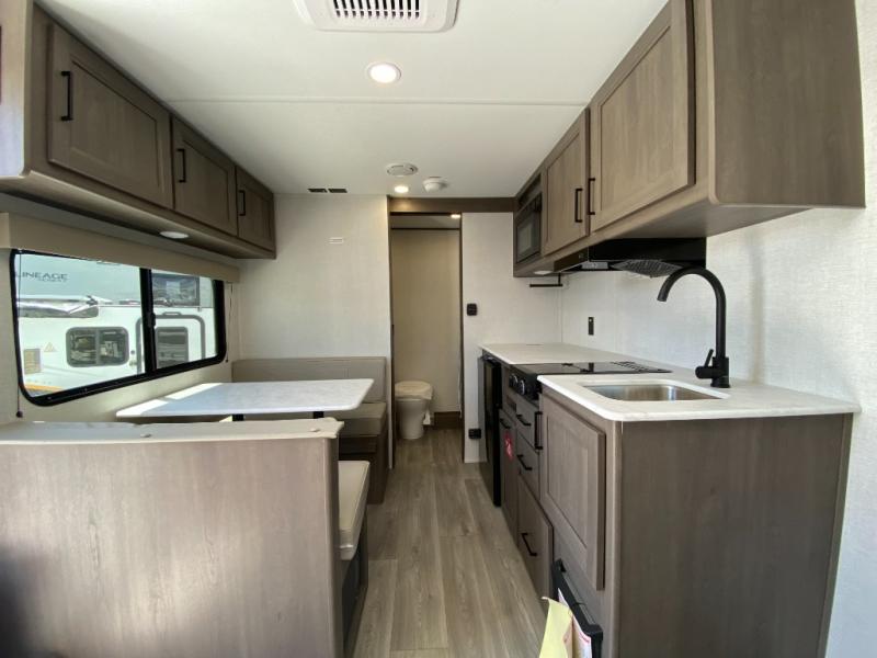 With any Transcend One travel trailer by Grand Design, you will enjoy lightweight towing thanks to their single-axle. There are many interior comforts to make camping easier than ever, such as recessed lighting, residential countertops, and a 6' 6" interior height. Each model is constructed with a heated and enclosed underbelly with suspended tanks, a moisture barrier floor enclosure, and Thermofoil over the roof and front cap for added protection. And a JBL sound system will let you listen to tunes as you visit under the power awning with a Fusion light!