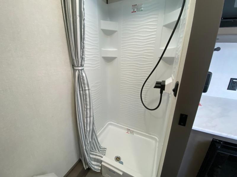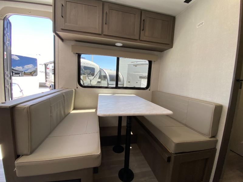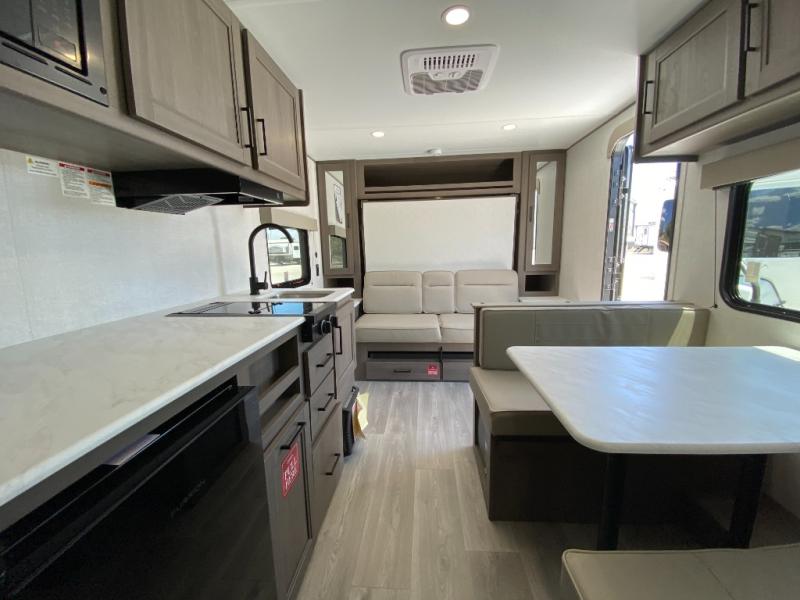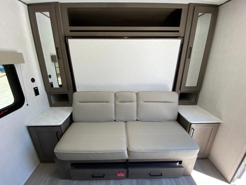 This is the perfect couple's trailer with versatile seating and sleeping space! You'll find a queen-size Murphy bed up front with storage space beside and above plus a full rear bath for added privacy. Once you've made lunch in the full kitchen, you can dine at the booth dinette, or take your plate outdoors to sit under the 10' power awning. You'll also find an unobstructed pass-thru storage outside that will be perfect for fishing poles, lawn chairs, tools and more!
