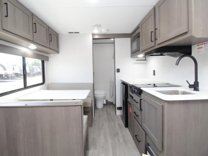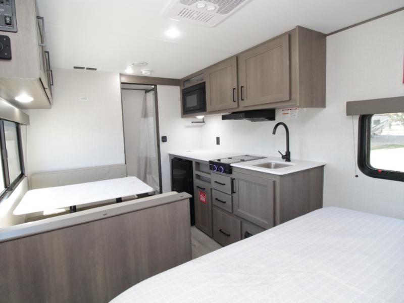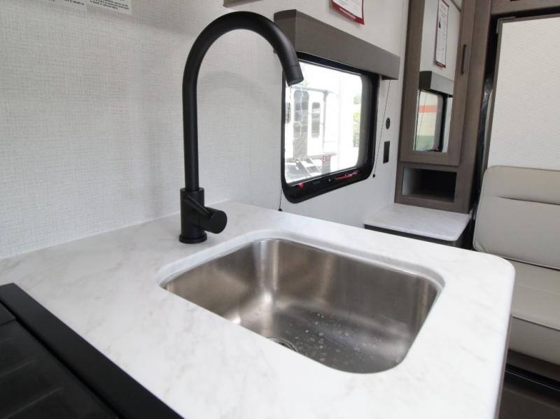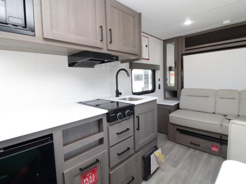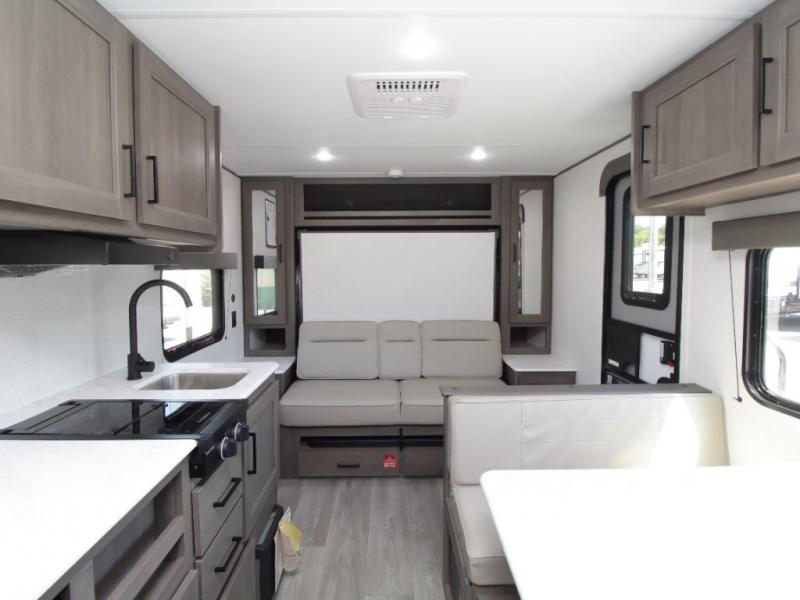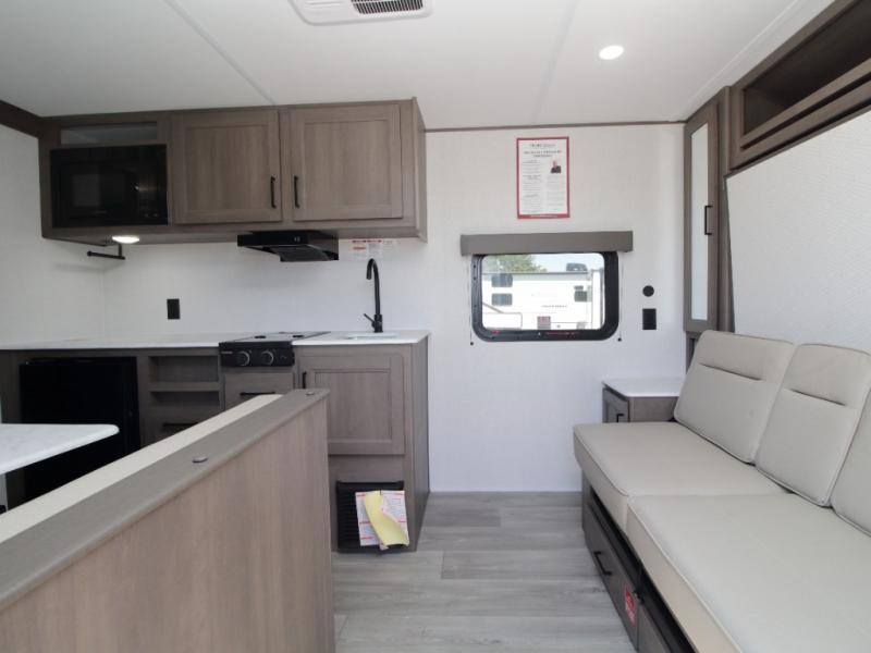 Inside, you’ll find a full kitchen with a cooktop, microwave, refrigerator, and plenty of counter space. The booth dinette is perfect for meals or can convert to sleeping space for a guest. Outside, enjoy the shade of the 10' power awning, cook with the LP quick connect, and store your gear in the pass-thru storage.