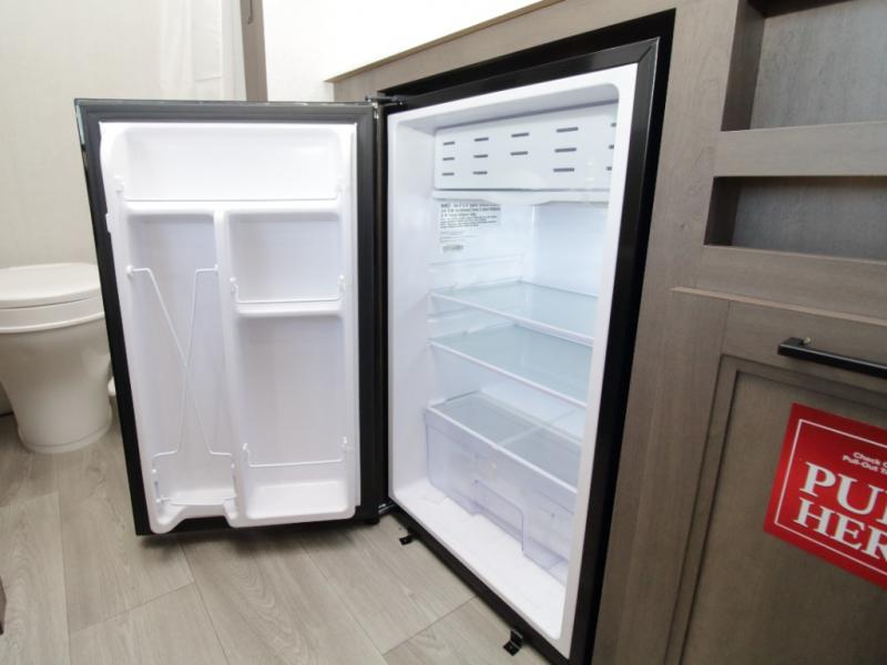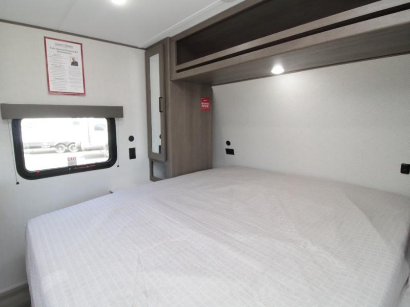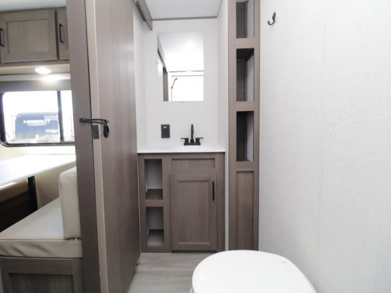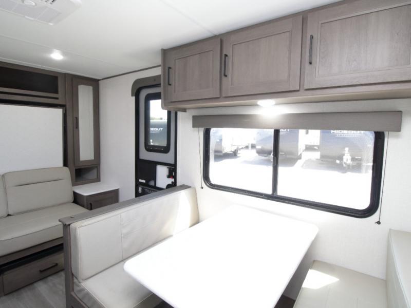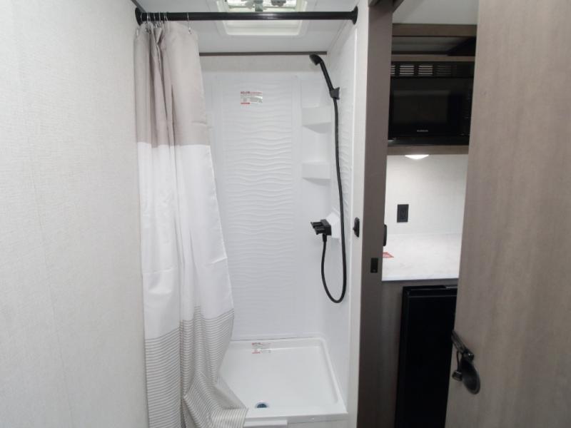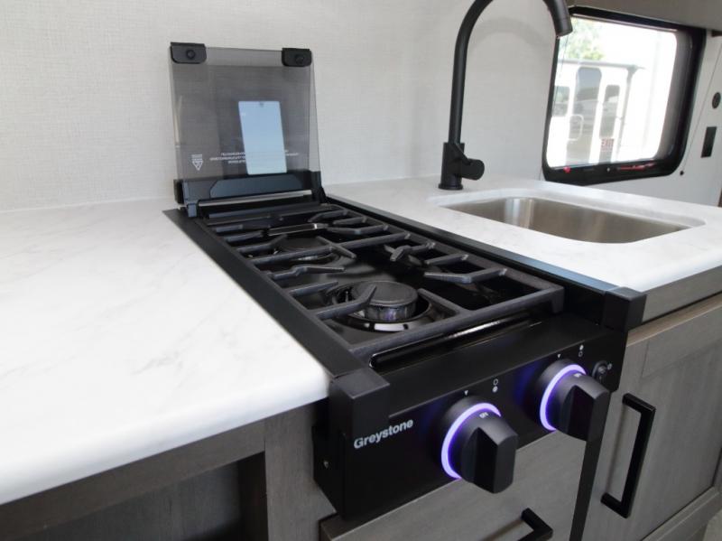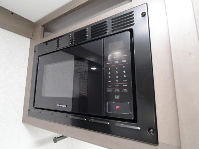 Inside, you’ll find a full kitchen with a cooktop, microwave, refrigerator, and plenty of counter space. The booth dinette is perfect for meals or can convert to sleeping space for a guest. Outside, enjoy the shade of the 10' power awning, cook with the LP quick connect, and store your gear in the pass-thru storage.