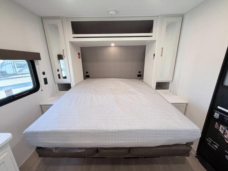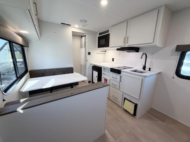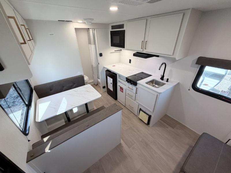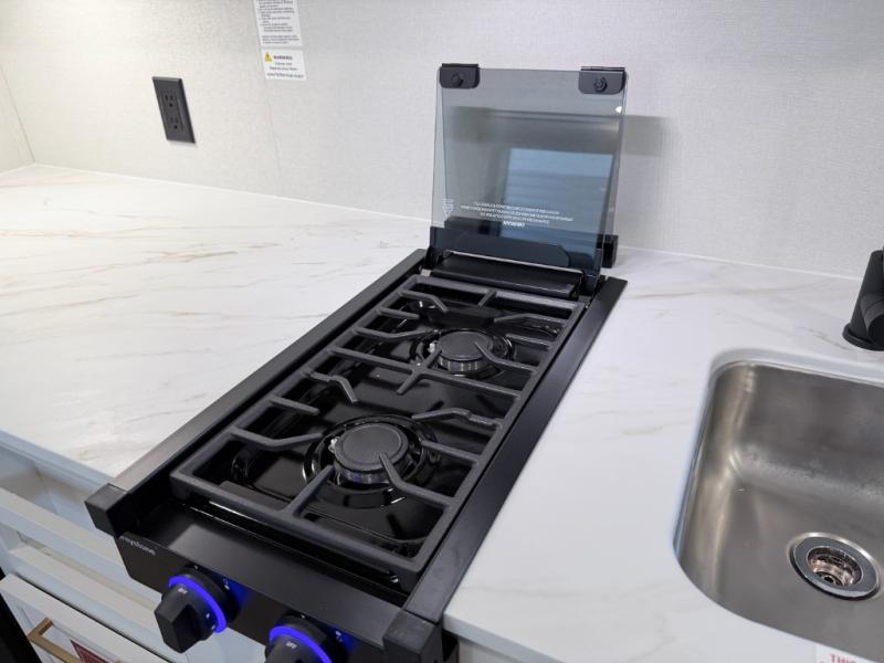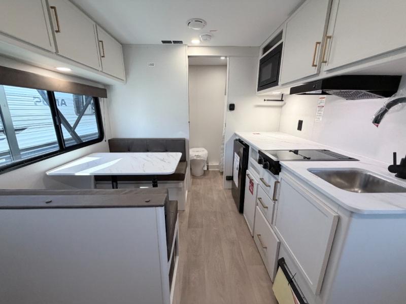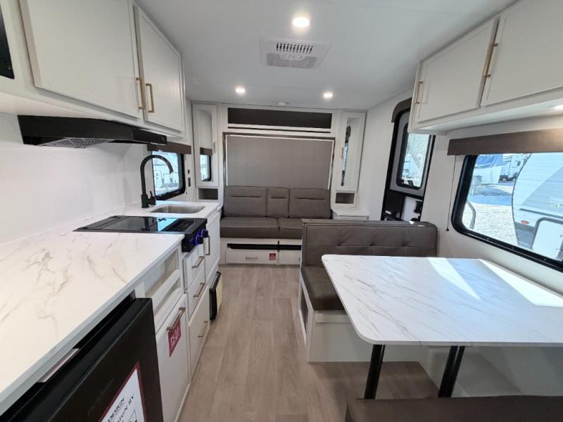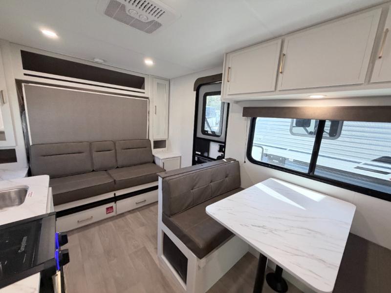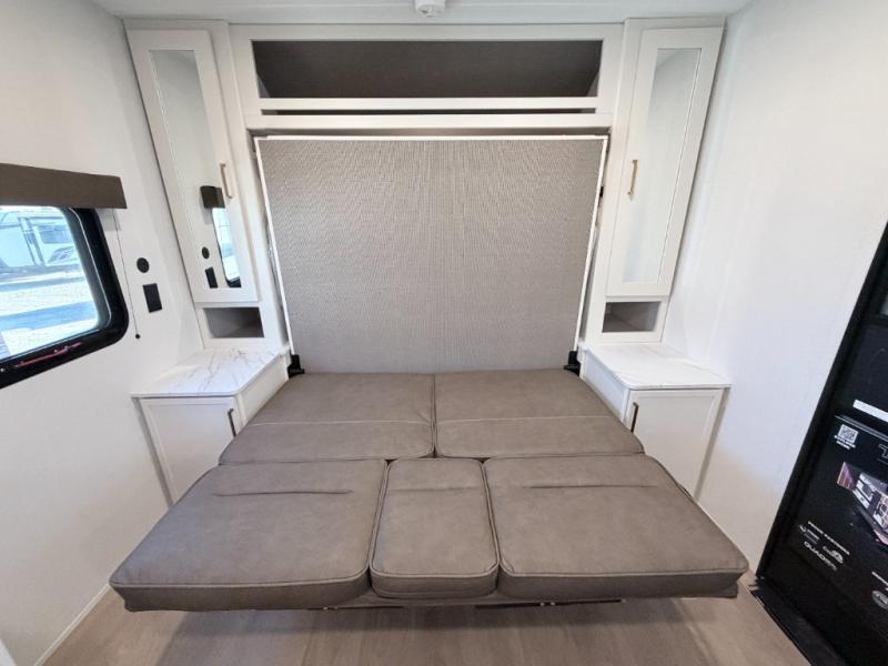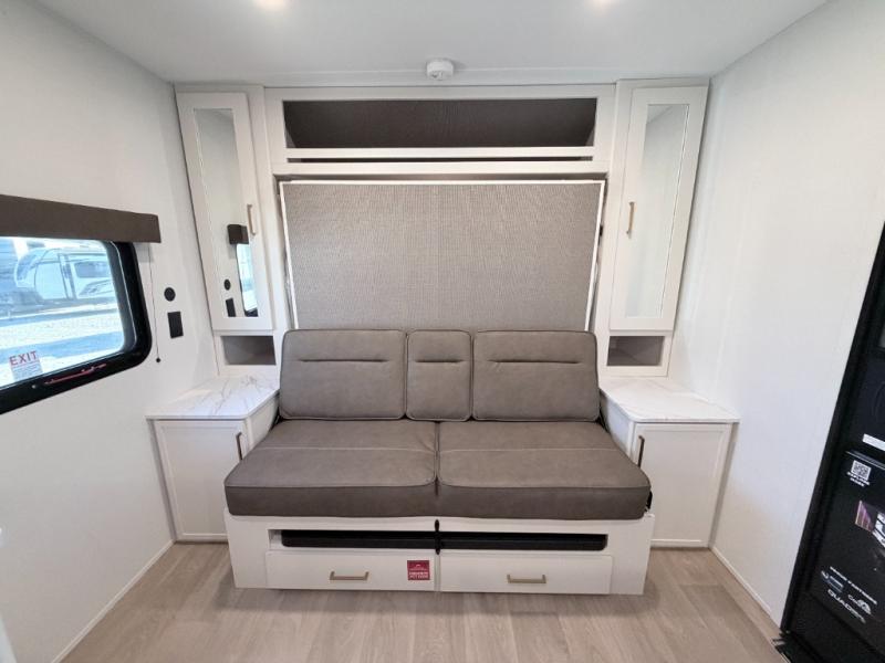 This versatile couple’s trailer delivers comfort in a compact footprint. A queen-size Murphy bed provides a cozy place to sleep and conveniently tucks away to open up the living space during the day. Storage cabinets above and beside the bed keep essentials organized, while the spacious full rear bath offers added privacy and convenience.