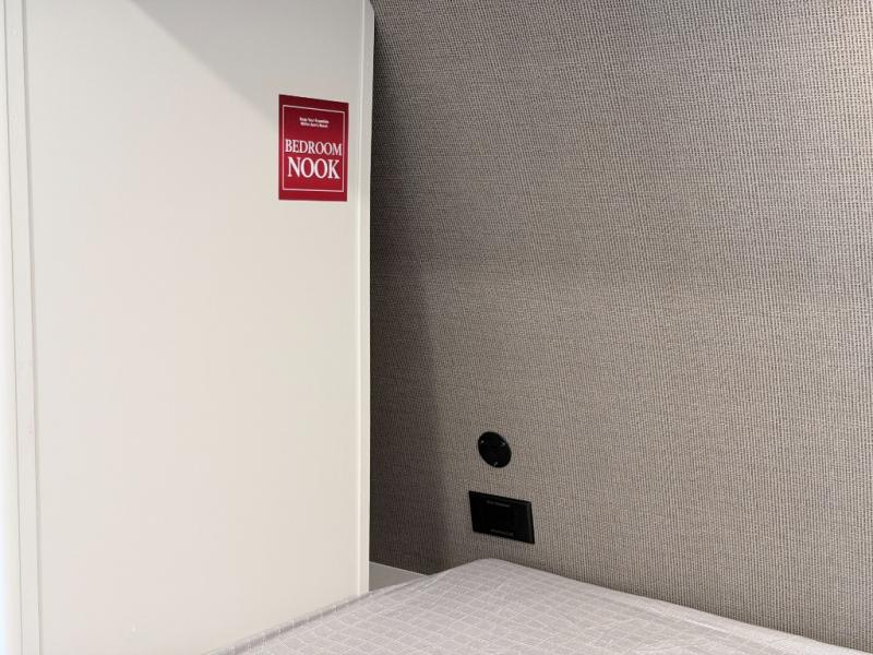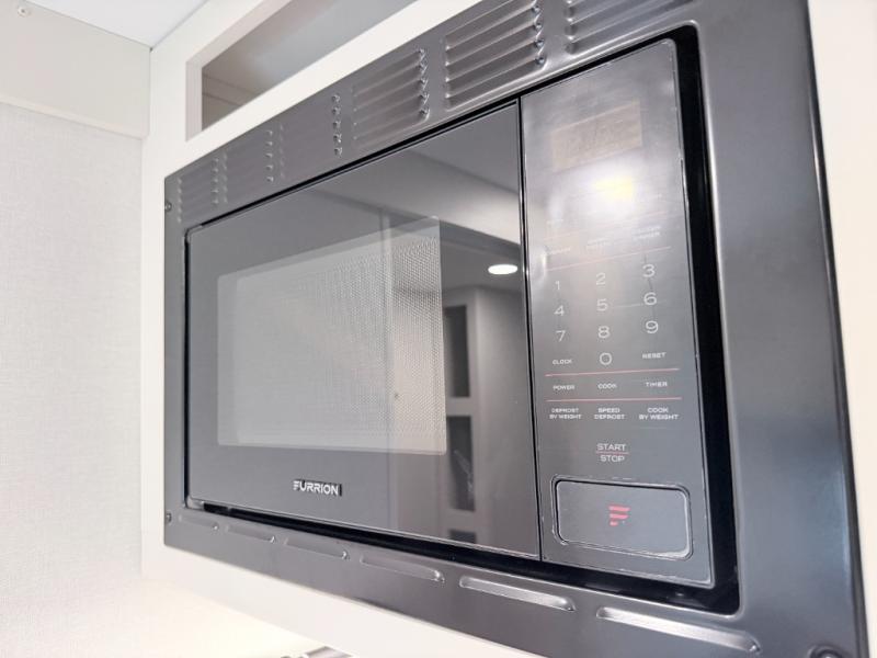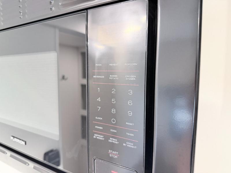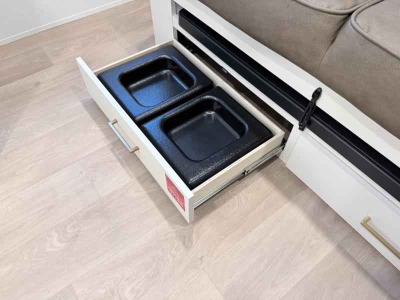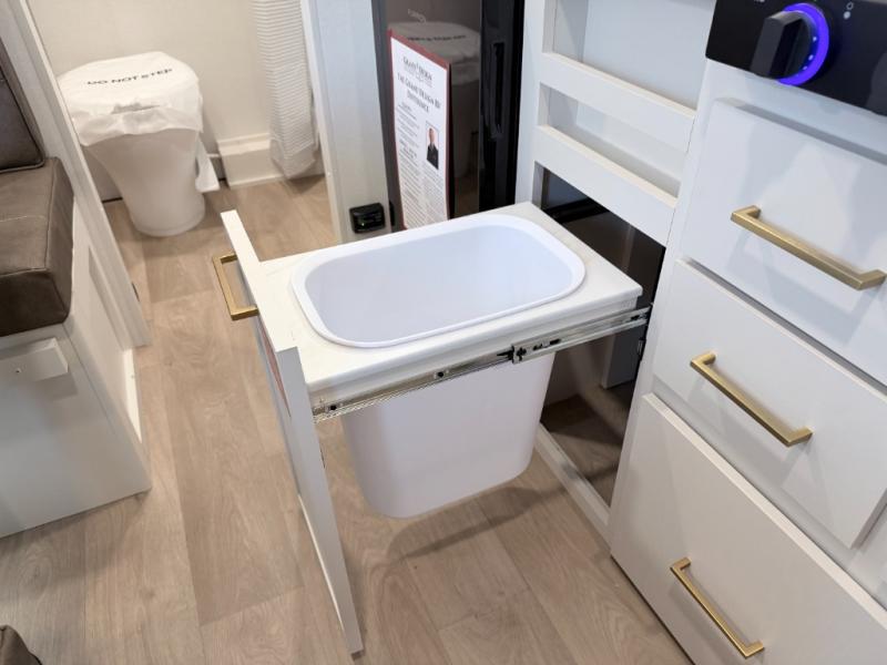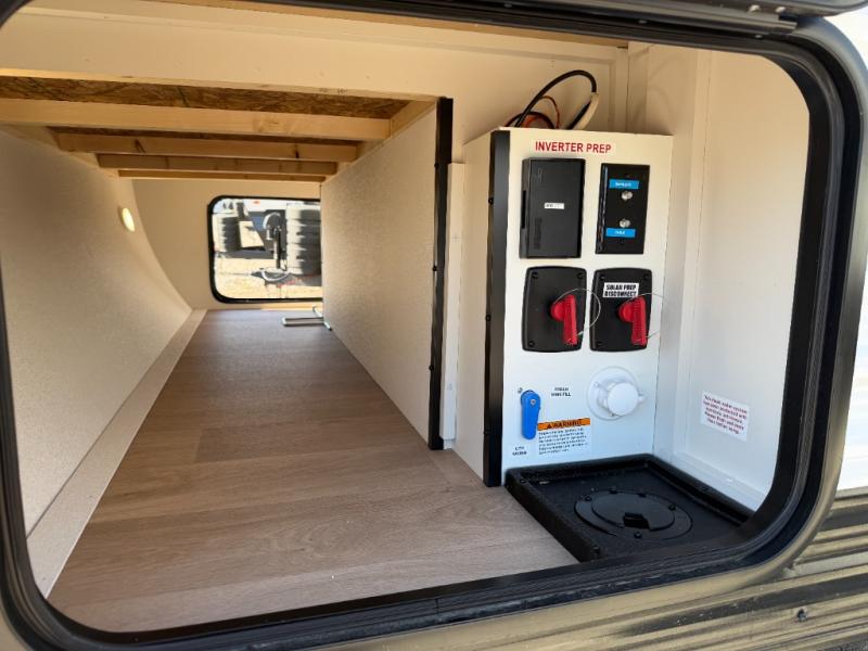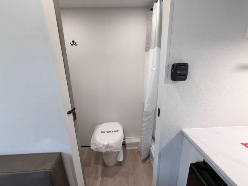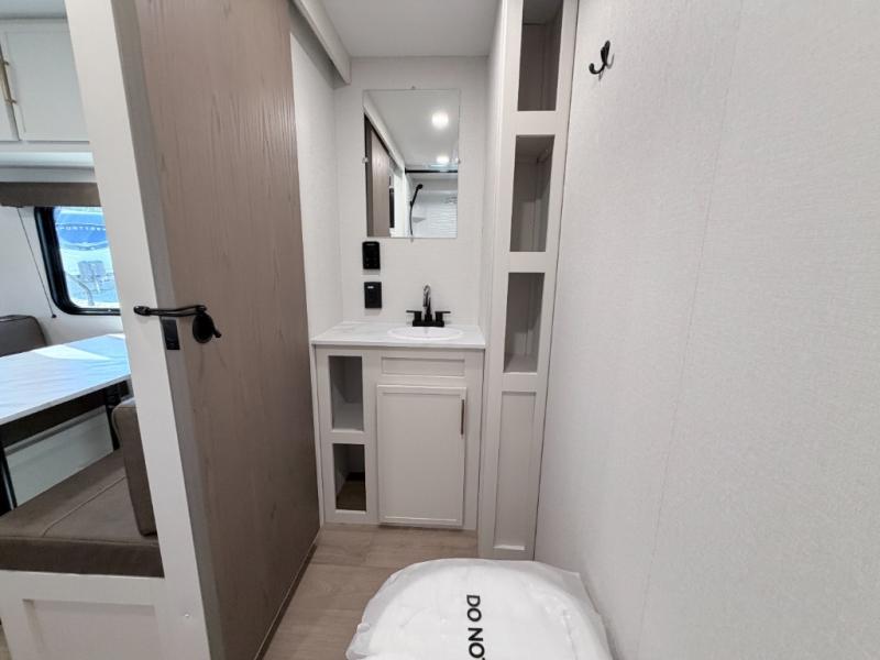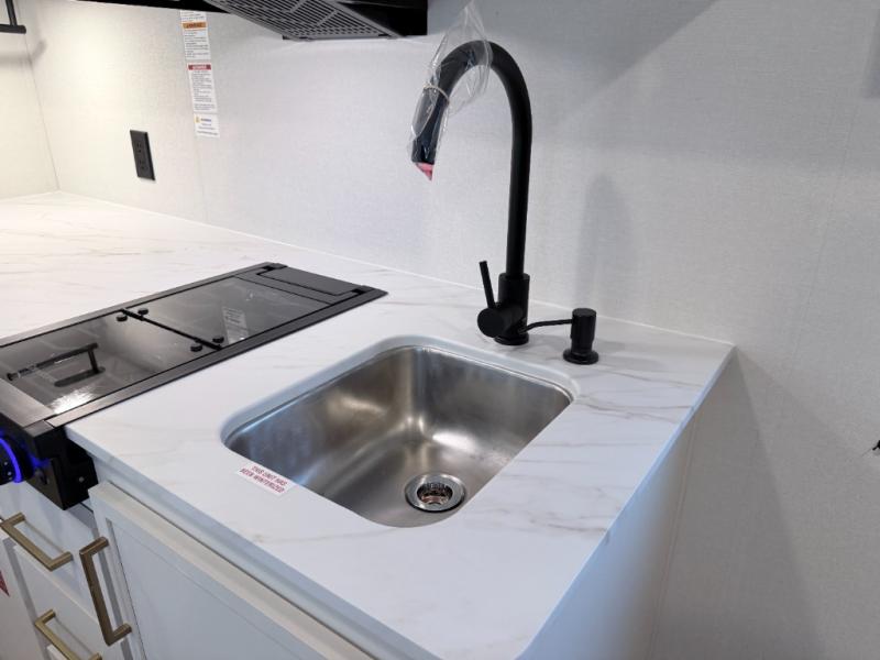 This versatile couple’s trailer delivers comfort in a compact footprint. A queen-size Murphy bed provides a cozy place to sleep and conveniently tucks away to open up the living space during the day. Storage cabinets above and beside the bed keep essentials organized, while the spacious full rear bath offers added privacy and convenience.