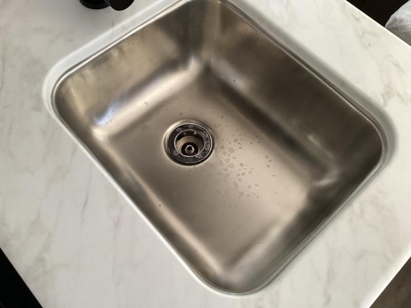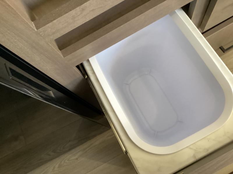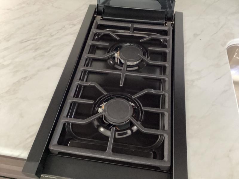 Well-laid-out area with a sink, two-burner cooktop, microwave, and 12V fridge makes cooking a breeze on the road. -