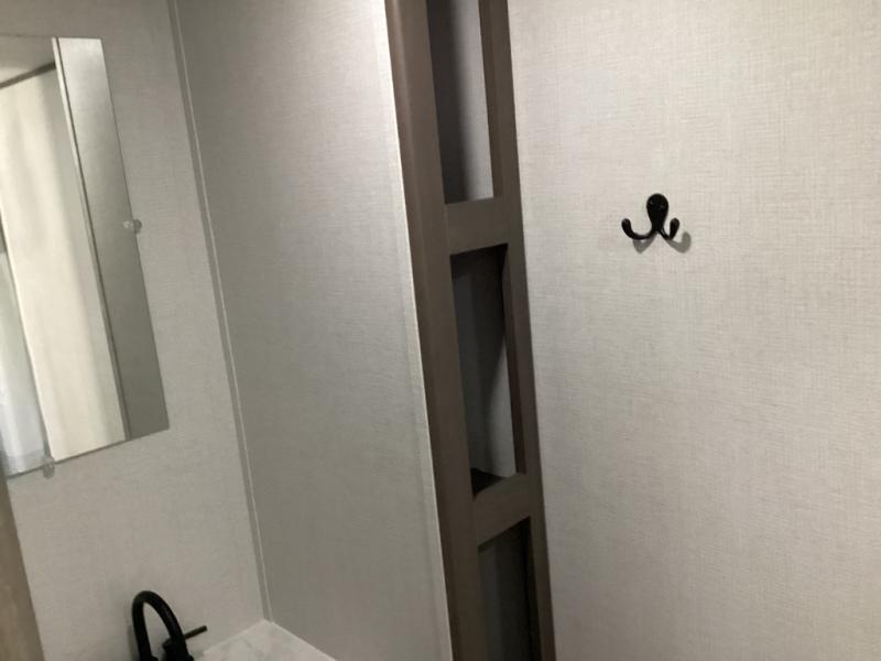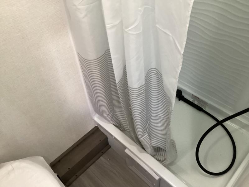 Full shower, toilet, and vanity in the back offer privacy and convenience after a day of exploring. -