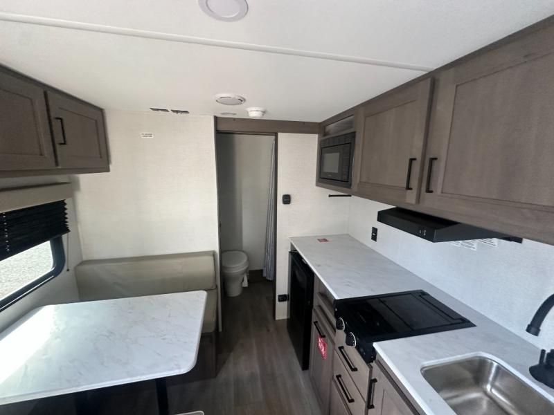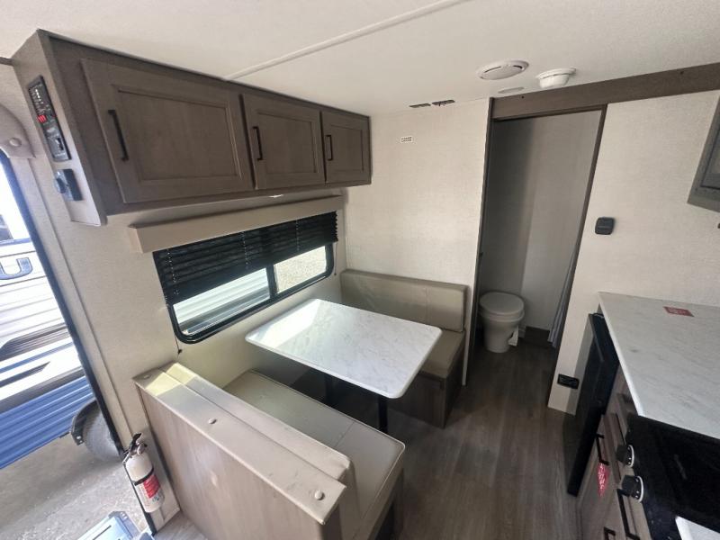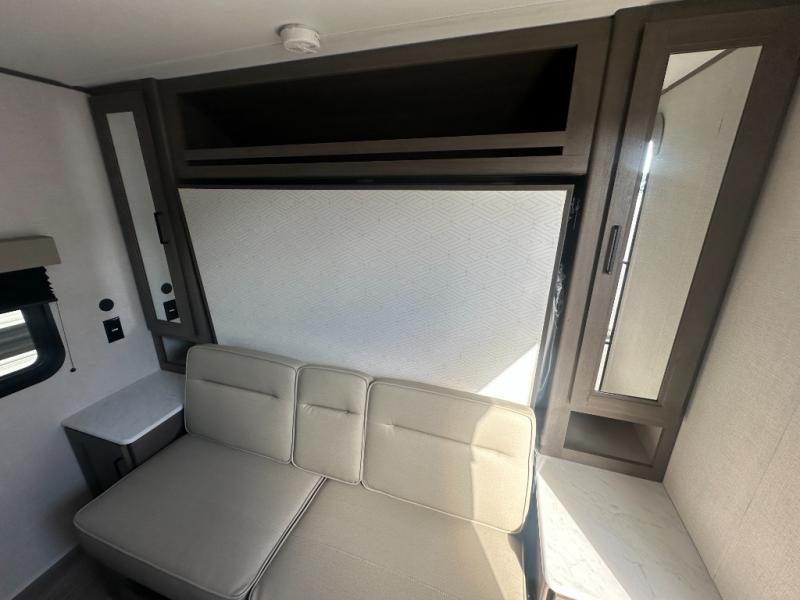 This is the perfect couple's trailer with versatile seating and sleeping space! You'll find a queen-size Murphy bed up front with storage space beside and above plus a full rear bath for added privacy. Once you've made lunch in the full kitchen, you can dine at the booth dinette, or take your plate outdoors to sit under the 10' power awning. You'll also find an unobstructed pass-thru storage outside that will be perfect for fishing poles, lawn chairs, tools and more!