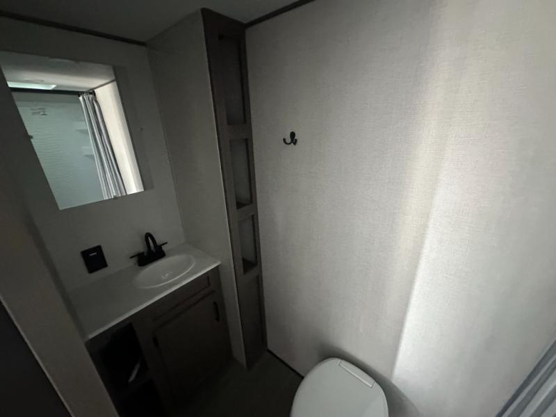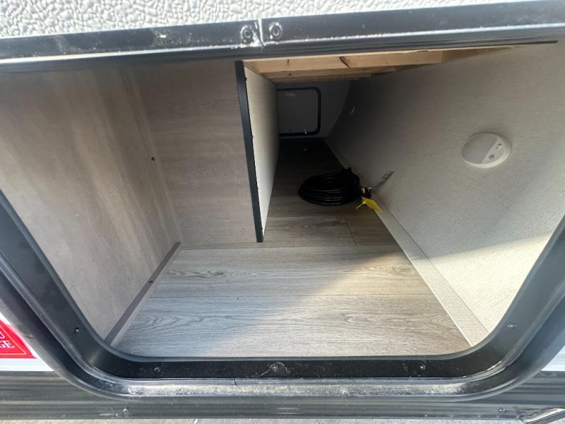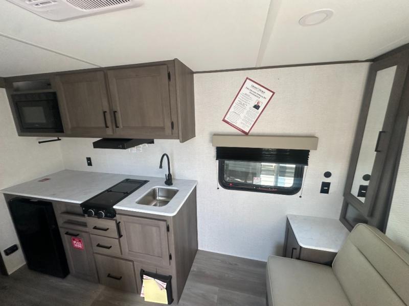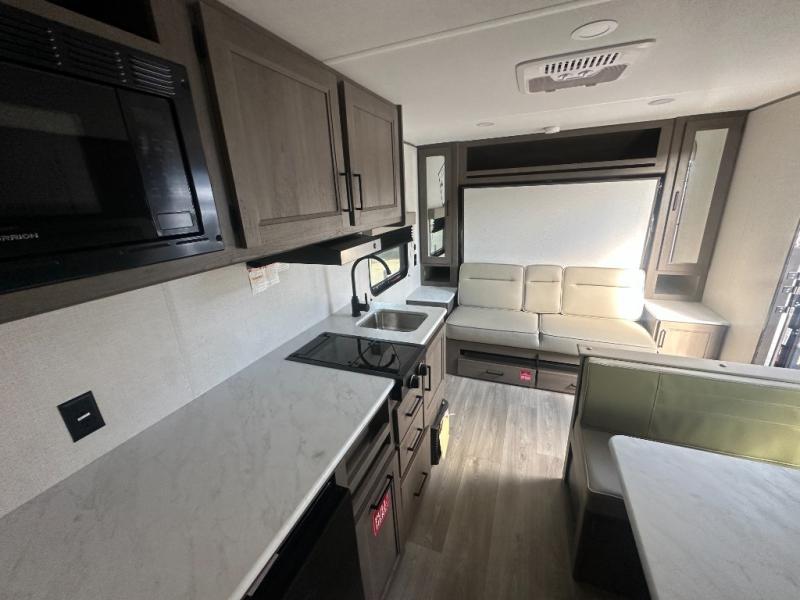 This is the perfect couple's trailer with versatile seating and sleeping space! You'll find a queen-size Murphy bed up front with storage space beside and above plus a full rear bath for added privacy. Once you've made lunch in the full kitchen, you can dine at the booth dinette, or take your plate outdoors to sit under the 10' power awning. You'll also find an unobstructed pass-thru storage outside that will be perfect for fishing poles, lawn chairs, tools and more!