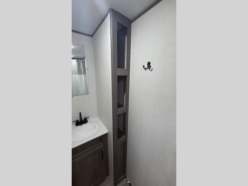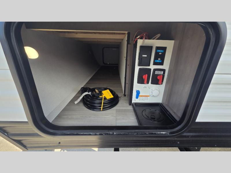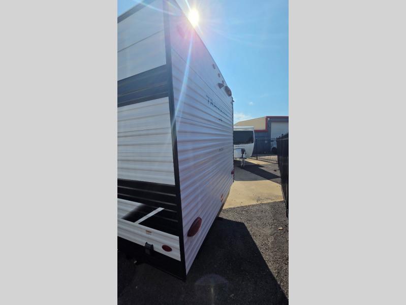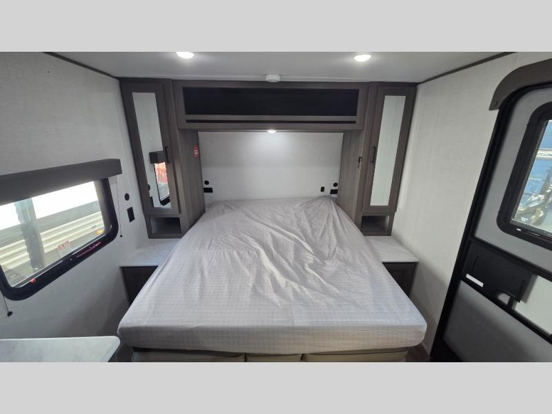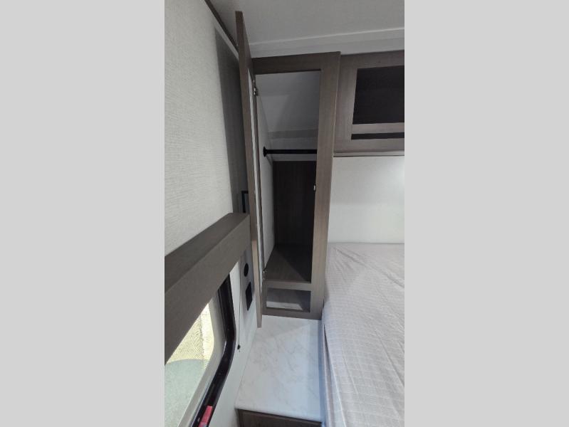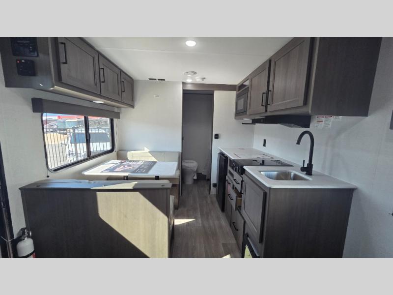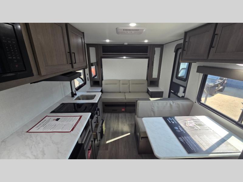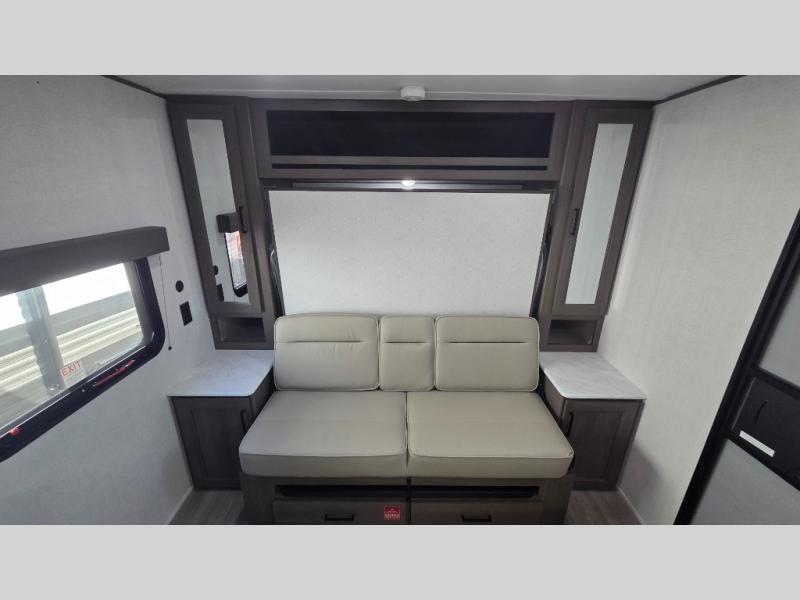 This is the perfect couple's trailer with versatile seating and sleeping space! You'll find a queen-size Murphy bed up front with storage space beside and above plus a full rear bath for added privacy. Once you've made lunch in the full kitchen, you can dine at the booth dinette, or take your plate outdoors to sit under the 10' power awning. You'll also find an unobstructed pass-thru storage outside that will be perfect for fishing poles, lawn chairs, tools and more!