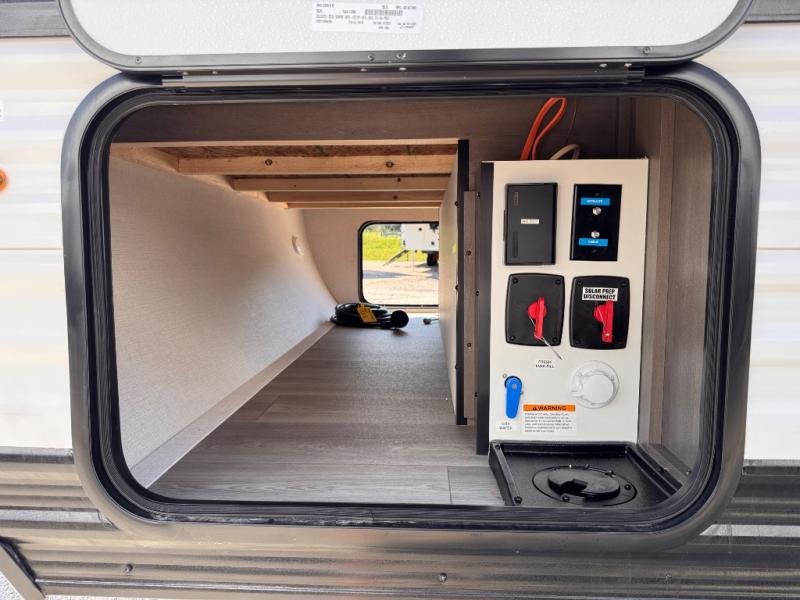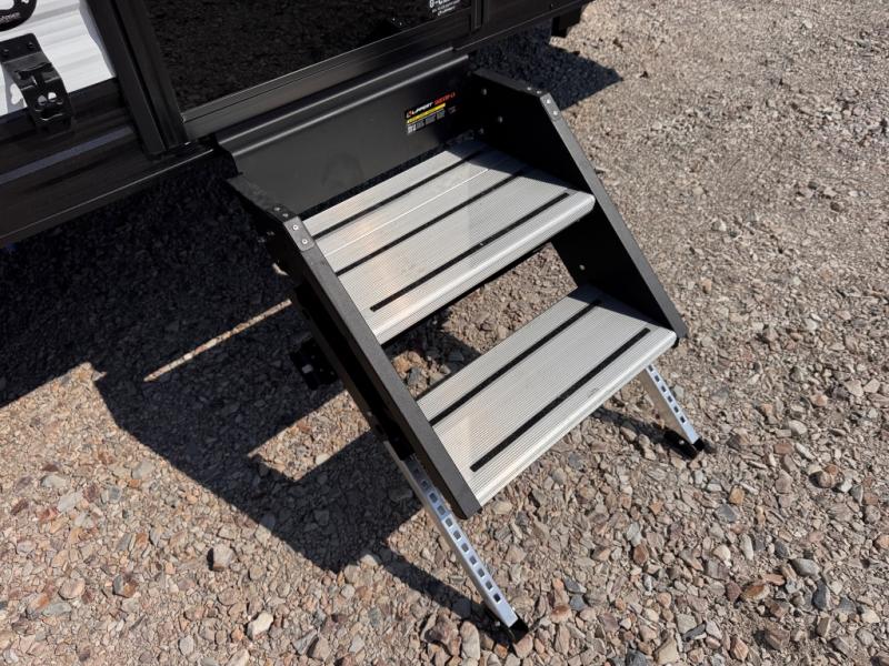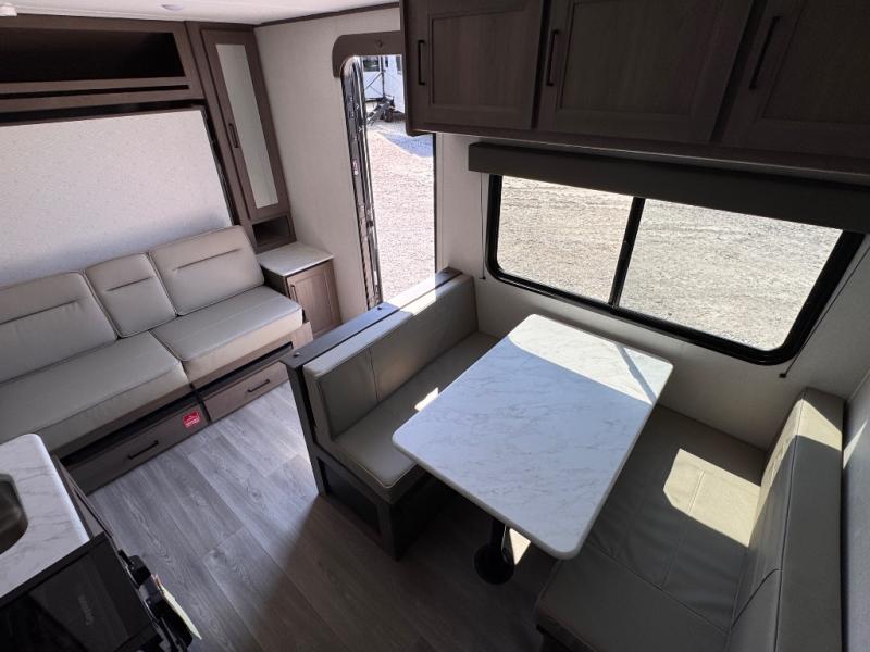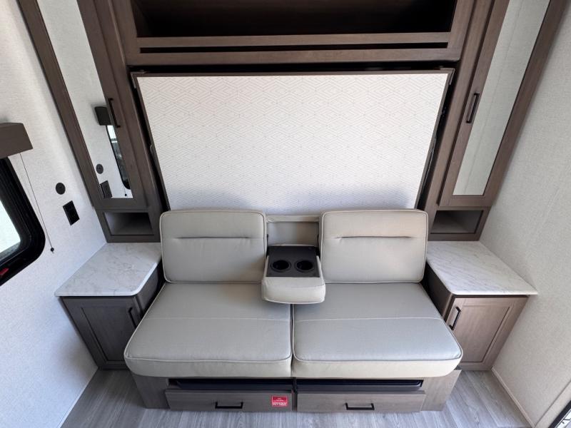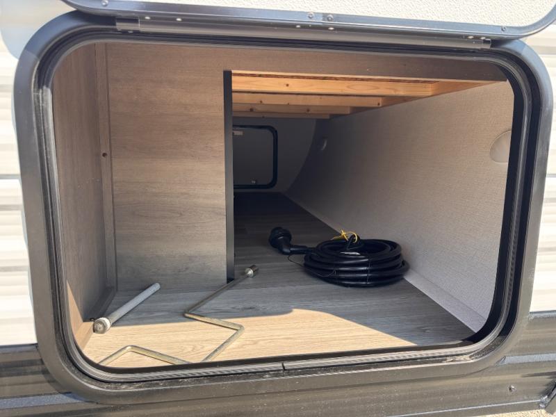 This is the perfect couple's trailer with versatile seating and sleeping space! You'll find a queen-size Murphy bed up front with storage space beside and above plus a full rear bath for added privacy. Once you've made lunch in the full kitchen, you can dine at the booth dinette, or take your plate outdoors to sit under the 10' power awning. You'll also find an unobstructed pass-thru storage outside that will be perfect for fishing poles, lawn chairs, tools and more!