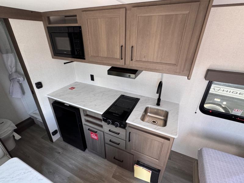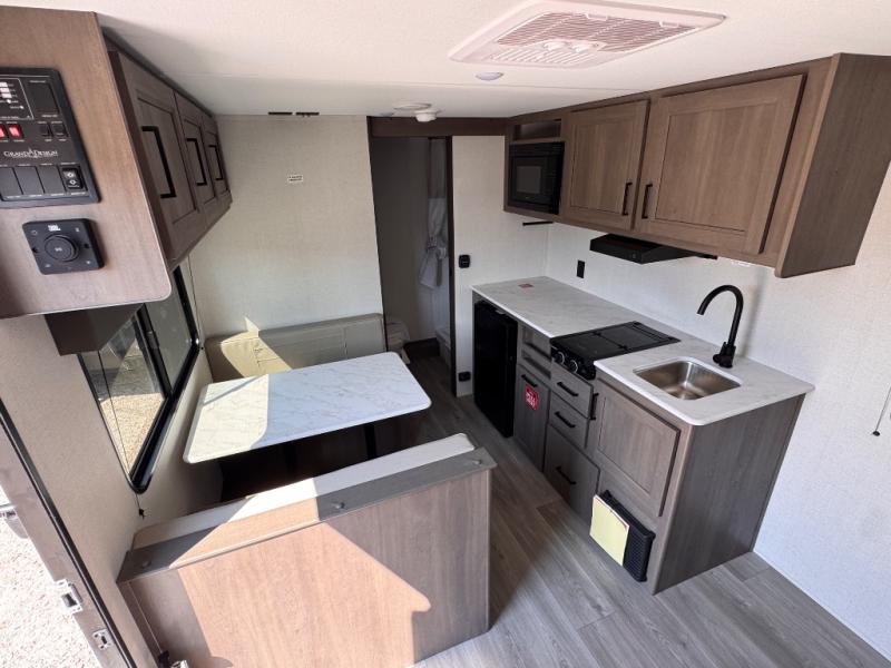 With any Transcend One travel trailer by Grand Design, you will enjoy lightweight towing thanks to their single-axle. There are many interior comforts to make camping easier than ever, such as recessed lighting, residential countertops, and a 6' 6" interior height. Each model is constructed with a heated and enclosed underbelly with suspended tanks, a moisture barrier floor enclosure, and Thermofoil over the roof and front cap for added protection. And a JBL sound system will let you listen to tunes as you visit under the power awning with a Fusion light!