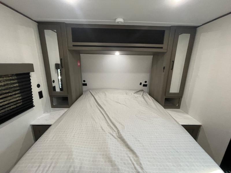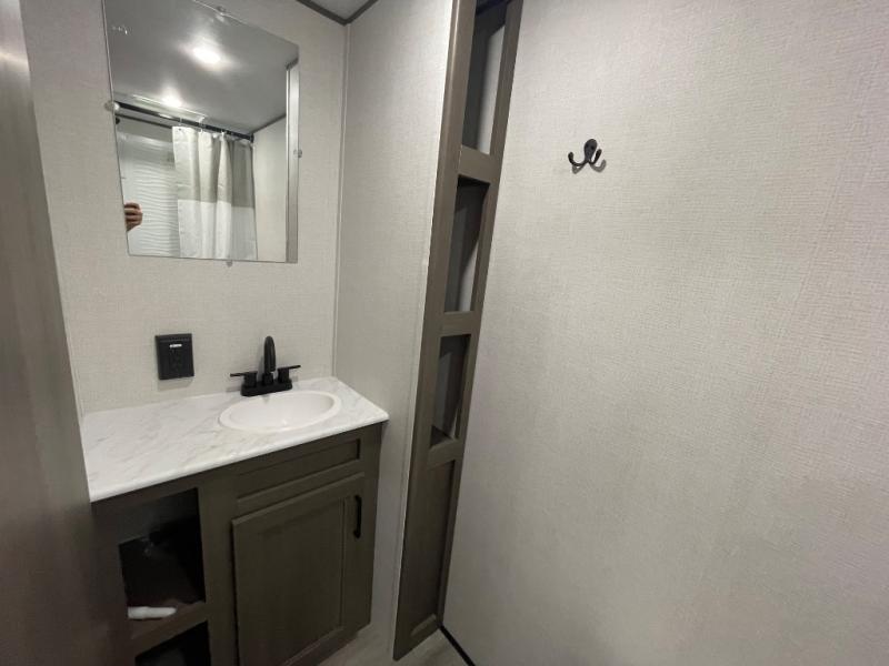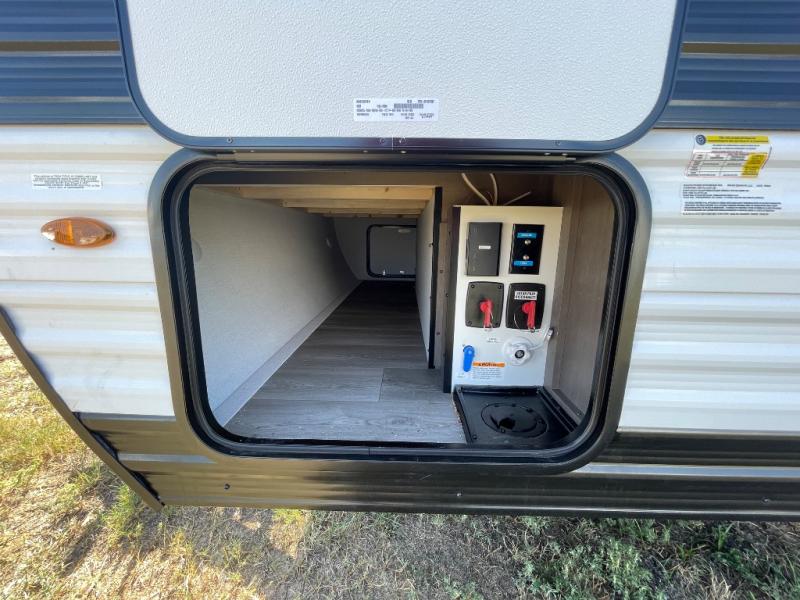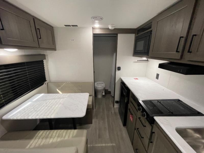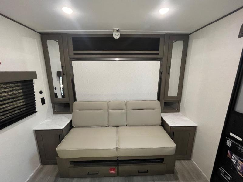 This is the perfect couple's trailer with versatile seating and sleeping space! You'll find a queen-size Murphy bed up front with storage space beside and above plus a full rear bath for added privacy. Once you've made lunch in the full kitchen, you can dine at the booth dinette, or take your plate outdoors to sit under the 10' power awning. You'll also find an unobstructed pass-thru storage outside that will be perfect for fishing poles, lawn chairs, tools and more!