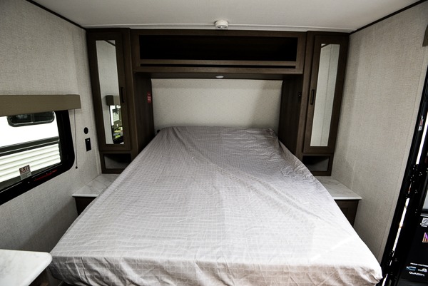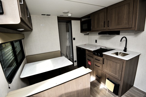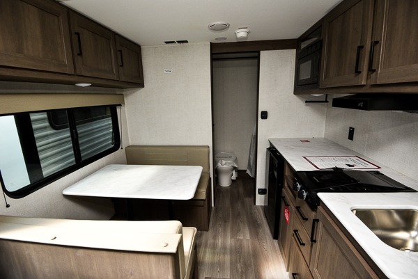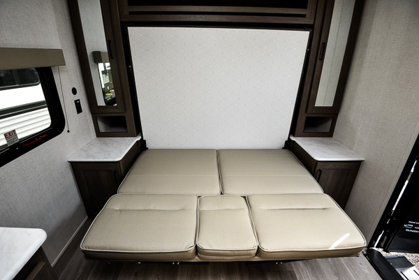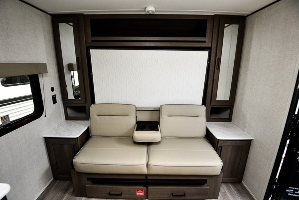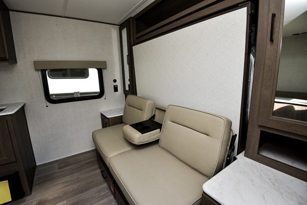 This is the perfect couple's trailer with versatile seating and sleeping space! You'll find a queen-size Murphy bed up front with storage space beside and above plus a full rear bath for added privacy. Once you've made lunch in the full kitchen, you can dine at the booth dinette or take your plate outdoors to sit under the 10' power awning. You'll also find pass-thru storage outside that will be perfect for fishing poles, lawn chairs, tools and more!