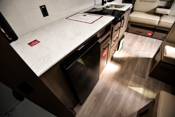 With any Transcend One travel trailer by Grand Design, you will enjoy lightweight towing thanks to their single-axle. There are many interior comforts to make camping easier than ever, such as recessed lighting, residential countertops, and a 6' 6" interior height. Each model is constructed with a heated and enclosed underbelly with suspended tanks, a moisture barrier floor enclosure, and Thermofoil over the roof and front cap for added protection. And a JBL sound system will let you listen to tunes as you visit under the power awning with a Fusion light!