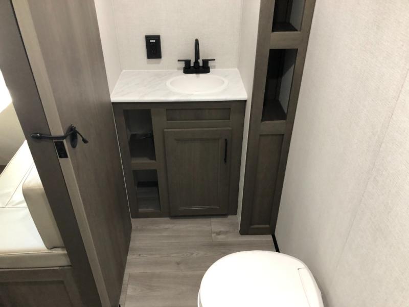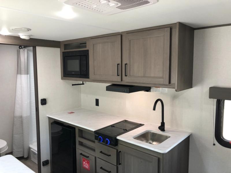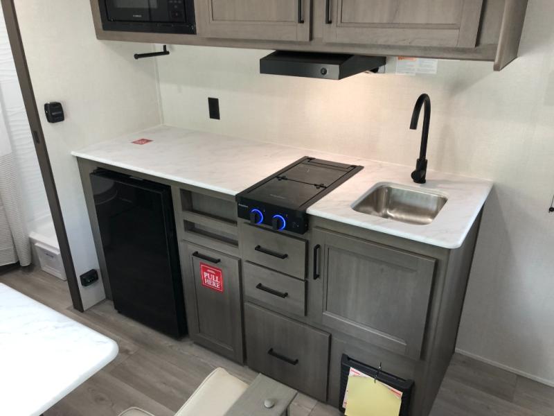 With any Transcend One travel trailer by Grand Design, you will enjoy lightweight towing thanks to their single-axle. There are many interior comforts to make camping easier than ever, such as recessed lighting, residential countertops, and a 6' 6" interior height. Each model is constructed with a heated and enclosed underbelly with suspended tanks, a moisture barrier floor enclosure, and Thermofoil over the roof and front cap for added protection. And a JBL sound system will let you listen to tunes as you visit under the power awning with a Fusion light!