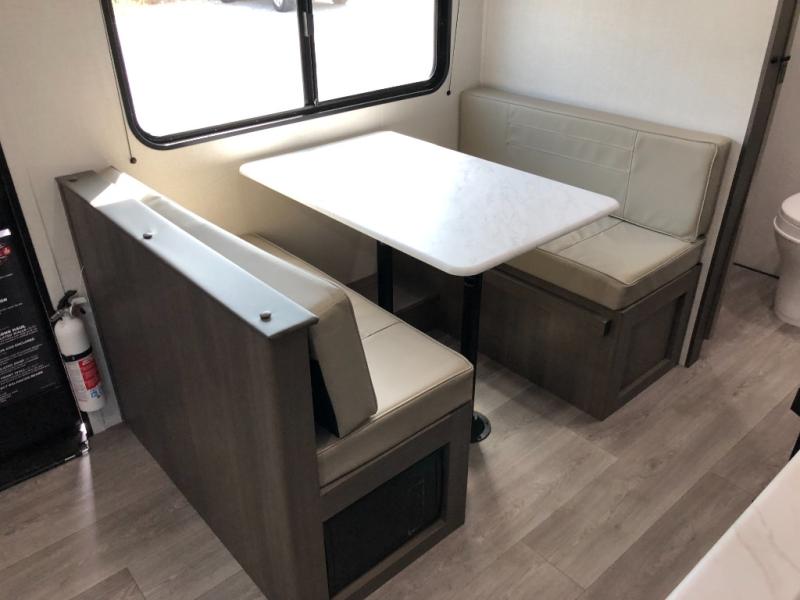 This is the perfect couple's trailer with versatile seating and sleeping space! You'll find a queen-size Murphy bed up front with storage space beside and above plus a full rear bath for added privacy. Once you've made lunch in the full kitchen, you can dine at the booth dinette, or take your plate outdoors to sit under the 10' power awning. You'll also find an unobstructed pass-thru storage outside that will be perfect for fishing poles, lawn chairs, tools and more!