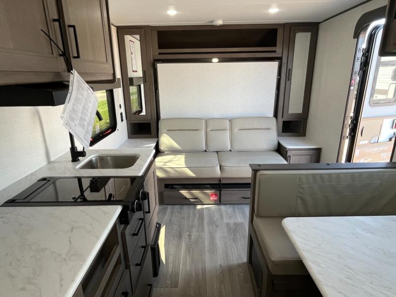 This is the perfect couple's trailer with versatile seating and sleeping space! You'll find a queen-size Murphy bed up front with storage space beside and above plus a full rear bath for added privacy. Once you've made lunch in the full kitchen, you can dine at the booth dinette, or take your plate outdoors to sit under the 10' power awning. You'll also find an unobstructed pass-thru storage outside that will be perfect for fishing poles, lawn chairs, tools and more!