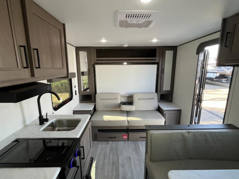 This is the perfect couple's trailer with versatile seating and sleeping space! You'll find a queen-size Murphy bed up front with storage space beside and above plus a full rear bath for added privacy. Once you've made lunch in the full kitchen, you can dine at the booth dinette, or take your plate outdoors to sit under the 10' power awning. You'll also find an unobstructed pass-thru storage outside that will be perfect for fishing poles, lawn chairs, tools and more!