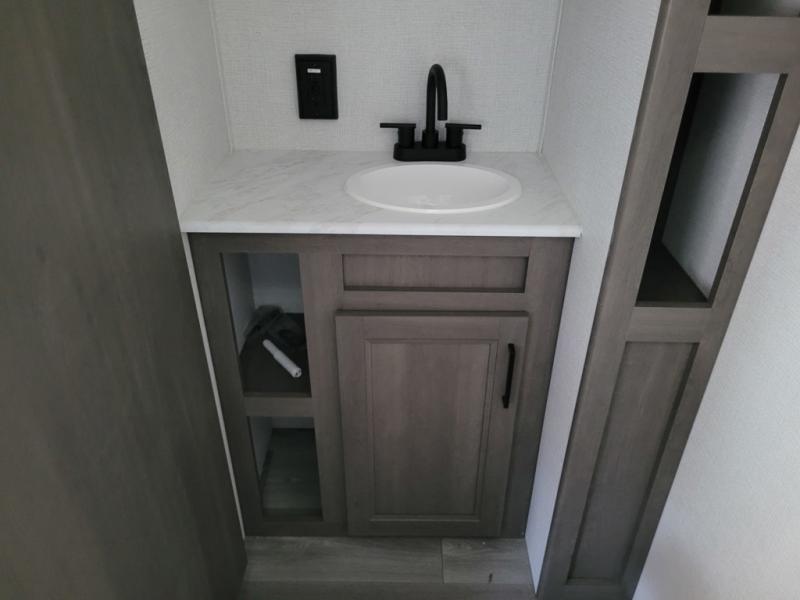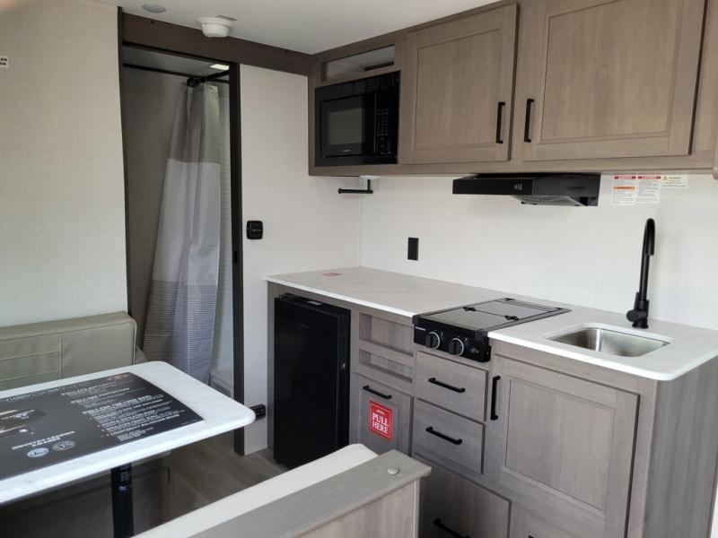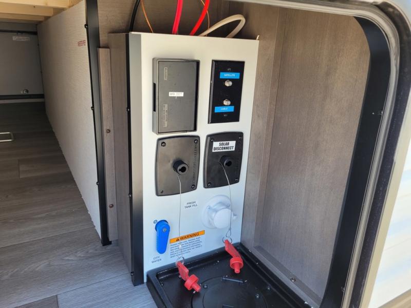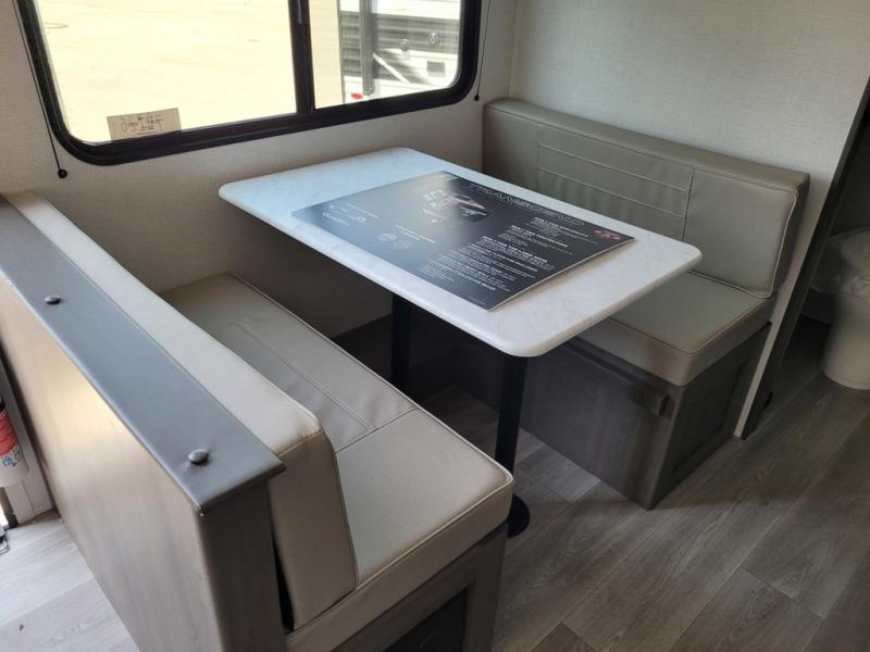 This is the perfect couple's trailer with versatile seating and sleeping space! You'll find a queen-size Murphy bed up front with storage space beside and above plus a full rear bath for added privacy. Once you've made lunch in the full kitchen, you can dine at the booth dinette, or take your plate outdoors to sit under the 10' power awning. You'll also find an unobstructed pass-thru storage outside that will be perfect for fishing poles, lawn chairs, tools and more!