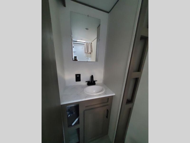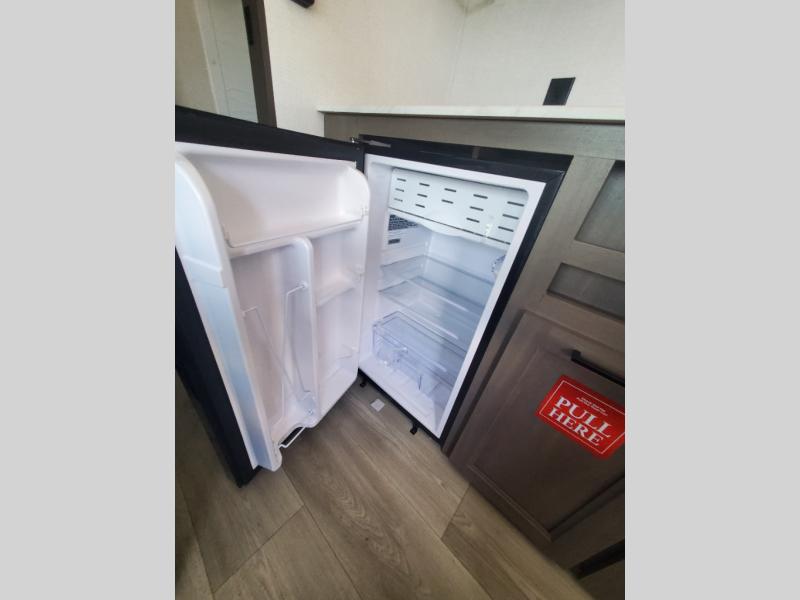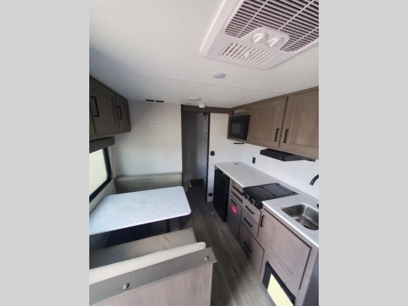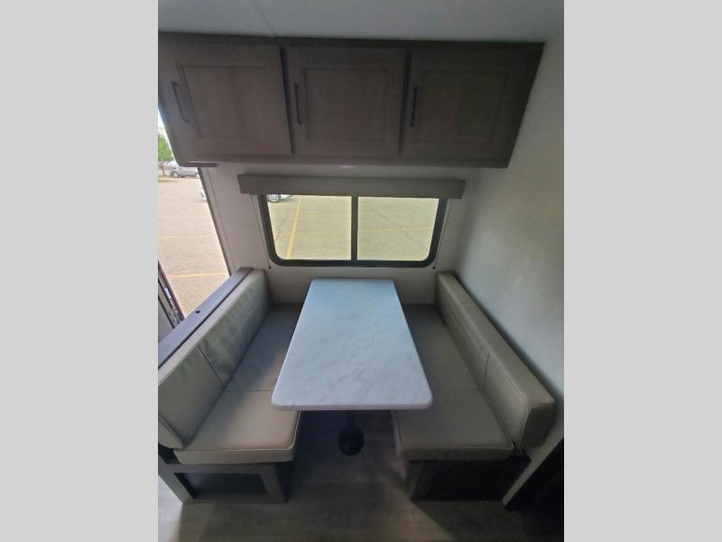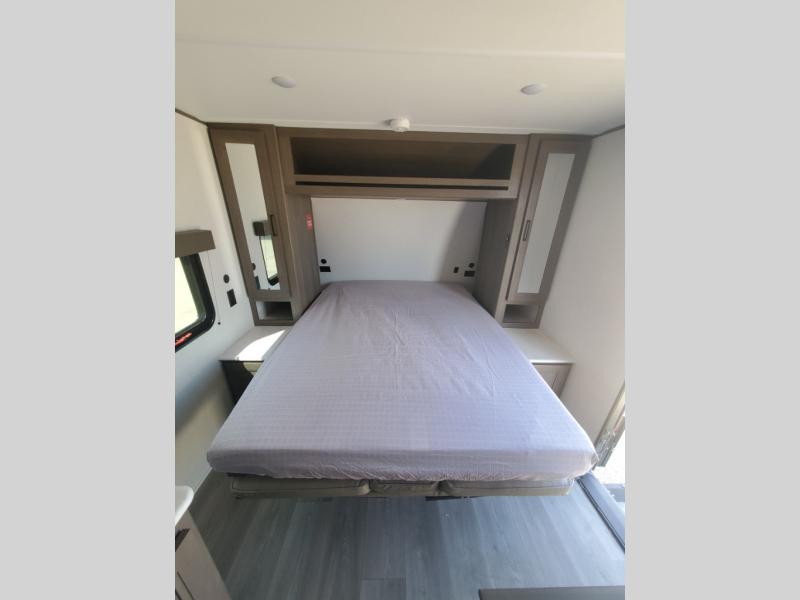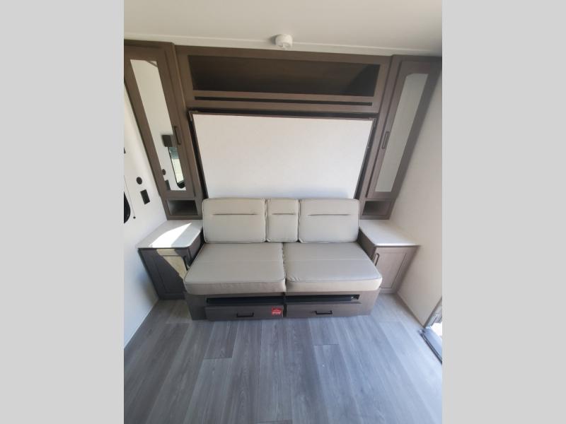 This is the perfect couple's trailer with versatile seating and sleeping space! You'll find a queen-size Murphy bed up front with storage space beside and above plus a full rear bath for added privacy. Once you've made lunch in the full kitchen, you can dine at the booth dinette, or take your plate outdoors to sit under the 10' power awning. You'll also find an unobstructed pass-thru storage outside that will be perfect for fishing poles, lawn chairs, tools and more!