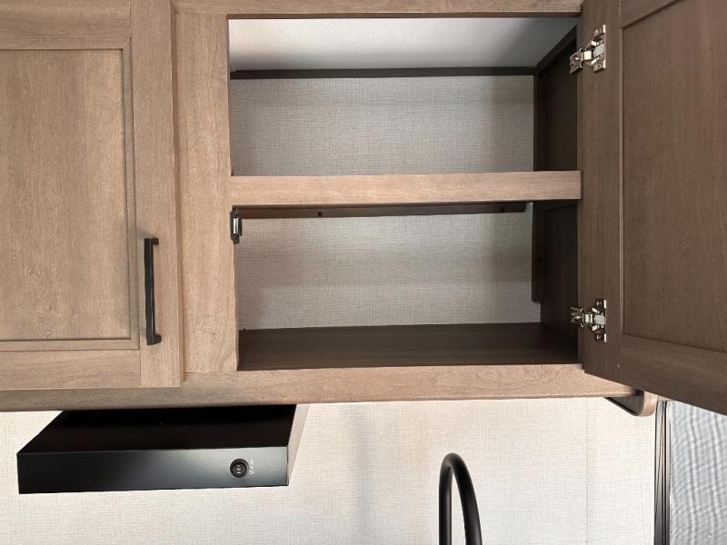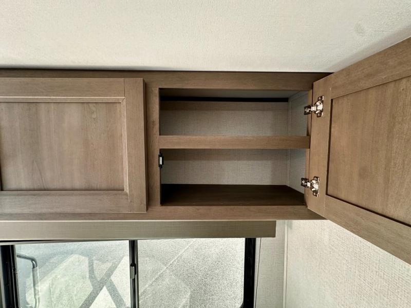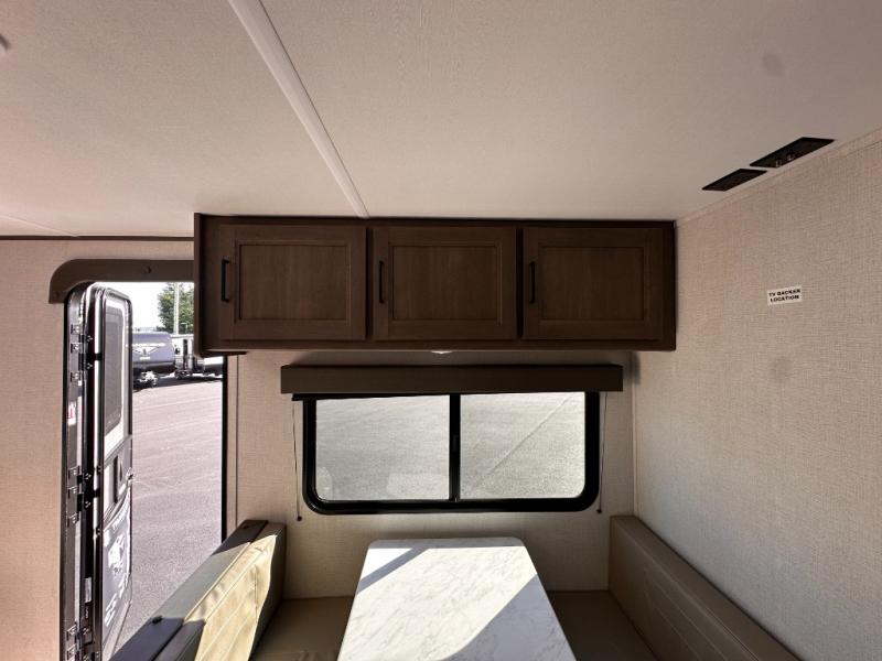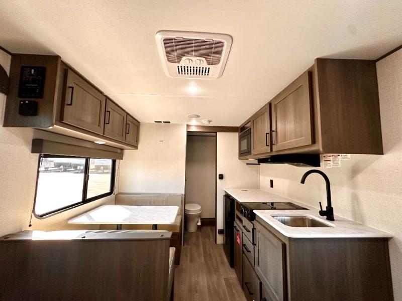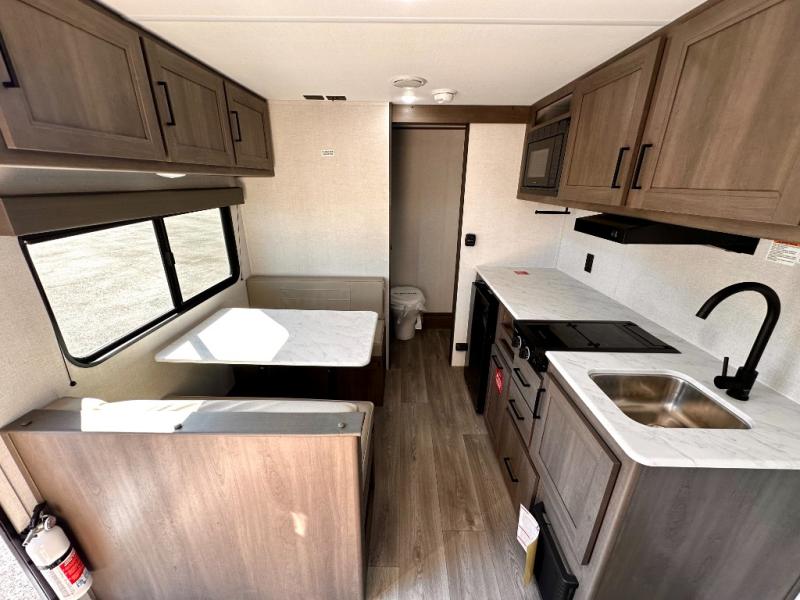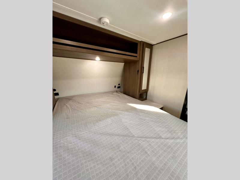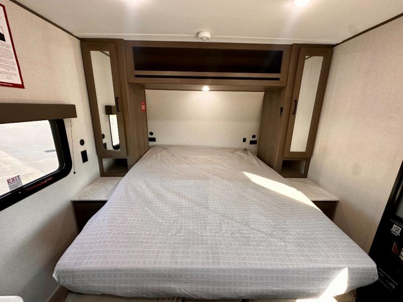 This is the perfect couple's trailer with versatile seating and sleeping space! You'll find a queen-size Murphy bed up front with storage space beside and above plus a full rear bath for added privacy. Once you've made lunch in the full kitchen, you can dine at the booth dinette, or take your plate outdoors to sit under the 10' power awning. You'll also find an unobstructed pass-thru storage outside that will be perfect for fishing poles, lawn chairs, tools and more!