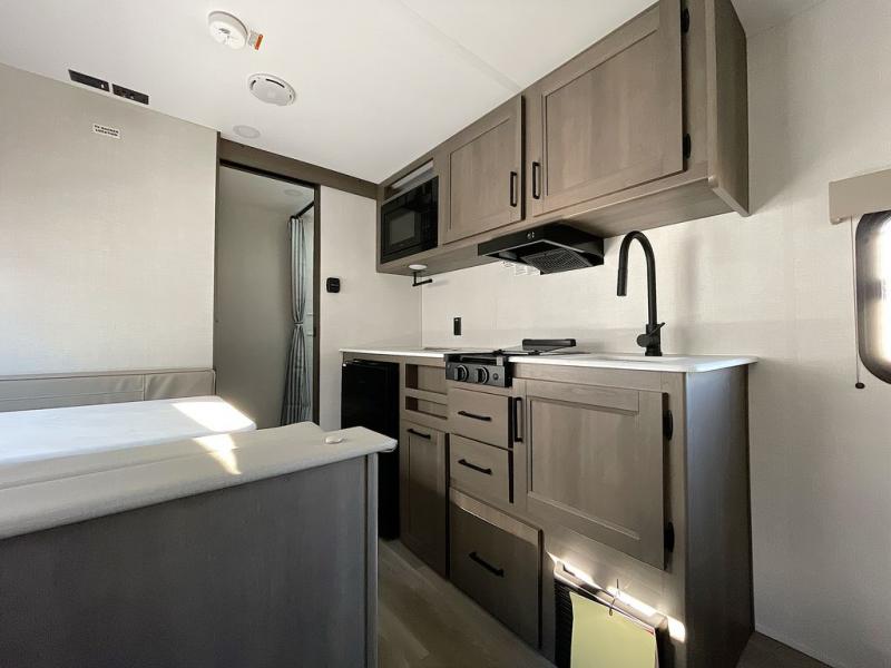 With any Transcend One travel trailer by Grand Design, you will enjoy lightweight towing thanks to their single-axle. There are many interior comforts to make camping easier than ever, such as recessed lighting, residential countertops, and a 6' 6" interior height. Each model is constructed with a heated and enclosed underbelly with suspended tanks, a moisture barrier floor enclosure, and Thermofoil over the roof and front cap for added protection. And a JBL sound system will let you listen to tunes as you visit under the power awning with a Fusion light!