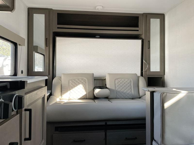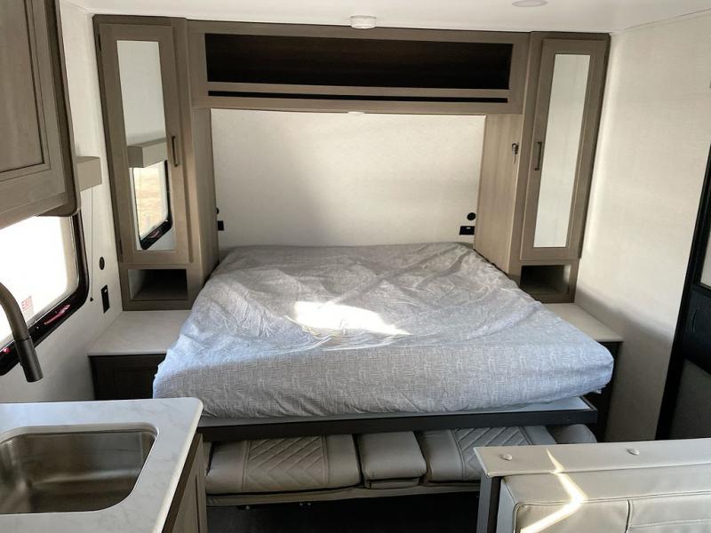 This is the perfect couple's trailer with versatile seating and sleeping space! You'll find a queen-size Murphy bed up front with storage space beside and above plus a full rear bath for added privacy. Once you've made lunch in the full kitchen, you can dine at the booth dinette, or take your plate outdoors to sit under the 10' power awning. You'll also find an unobstructed pass-thru storage outside that will be perfect for fishing poles, lawn chairs, tools and more!