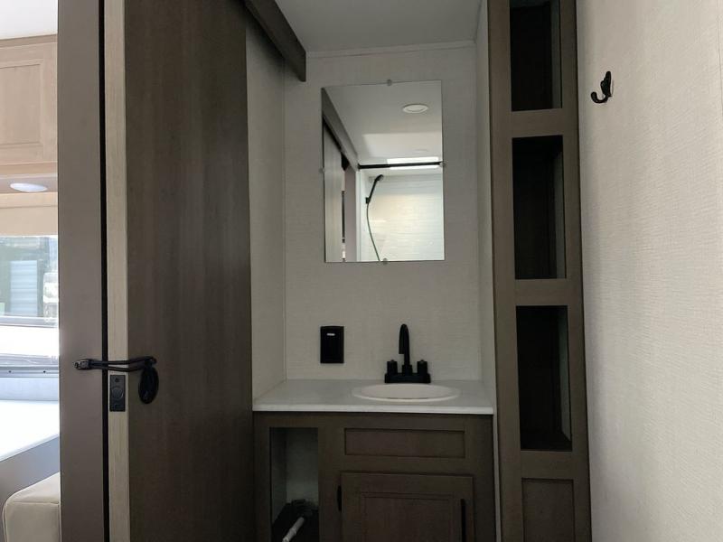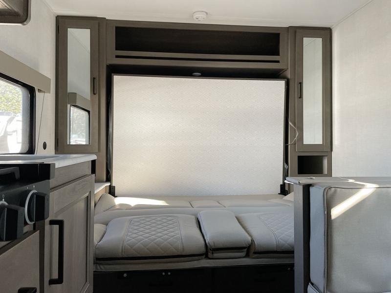 This is the perfect couple's trailer with versatile seating and sleeping space! You'll find a queen-size Murphy bed up front with storage space beside and above plus a full rear bath for added privacy. Once you've made lunch in the full kitchen, you can dine at the booth dinette, or take your plate outdoors to sit under the 10' power awning. You'll also find an unobstructed pass-thru storage outside that will be perfect for fishing poles, lawn chairs, tools and more!