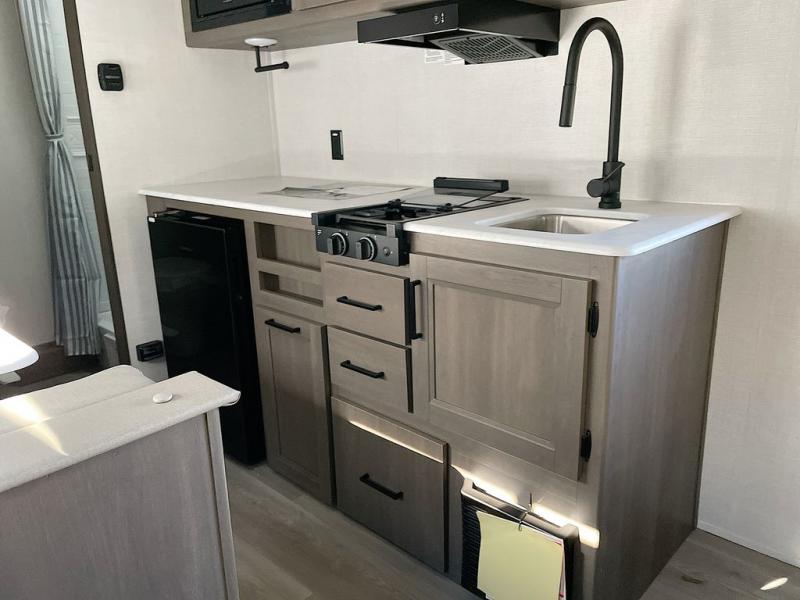 With any Transcend One travel trailer by Grand Design, you will enjoy lightweight towing thanks to their single-axle. There are many interior comforts to make camping easier than ever, such as recessed lighting, residential countertops, and a 6' 6" interior height. Each model is constructed with a heated and enclosed underbelly with suspended tanks, a moisture barrier floor enclosure, and Thermofoil over the roof and front cap for added protection. And a JBL sound system will let you listen to tunes as you visit under the power awning with a Fusion light!