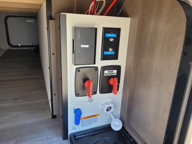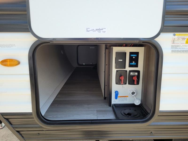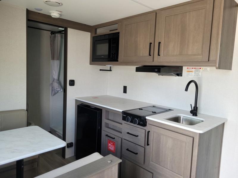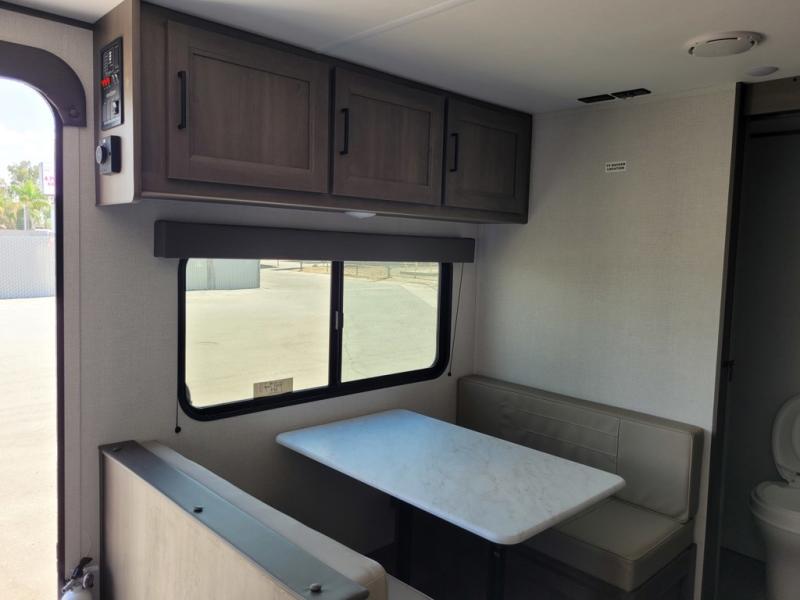 This is the perfect couple's trailer with versatile seating and sleeping space! You'll find a queen-size Murphy bed up front with storage space beside and above plus a full rear bath for added privacy. Once you've made lunch in the full kitchen, you can dine at the booth dinette, or take your plate outdoors to sit under the 10' power awning. You'll also find an unobstructed pass-thru storage outside that will be perfect for fishing poles, lawn chairs, tools and more!