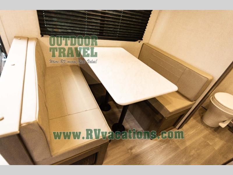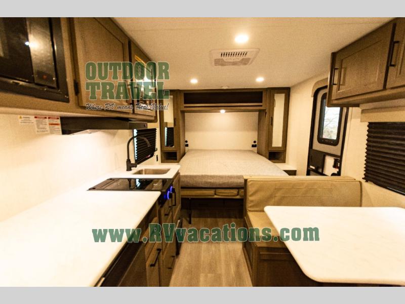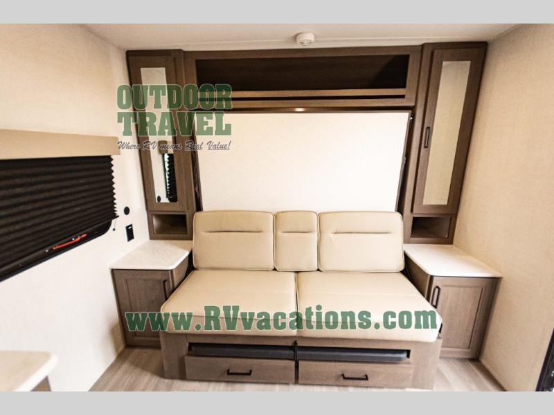 This is the perfect couple's trailer with versatile seating and sleeping space! You'll find a queen-size Murphy bed up front with storage space beside and above plus a full rear bath for added privacy. Once you've made lunch in the full kitchen, you can dine at the booth dinette, or take your plate outdoors to sit under the 10' power awning. You'll also find an unobstructed pass-thru storage outside that will be perfect for fishing poles, lawn chairs, tools and more!