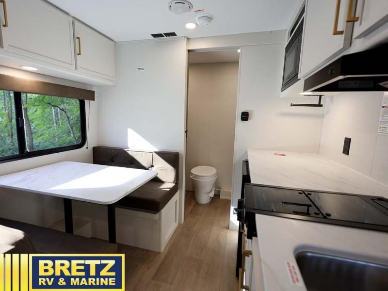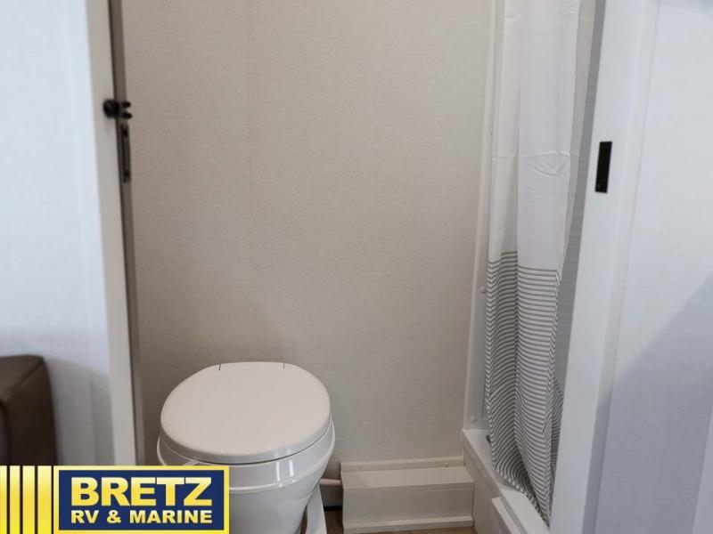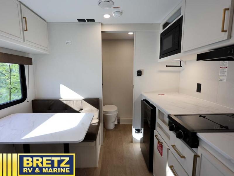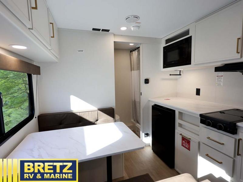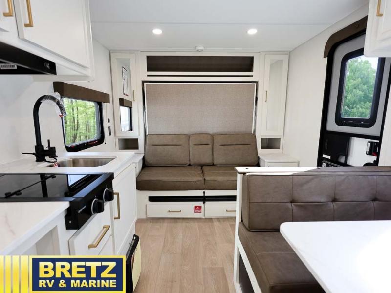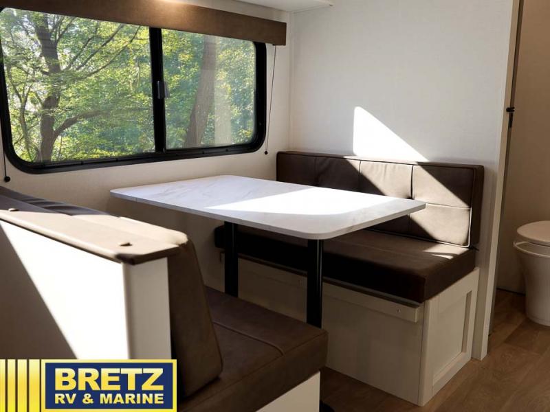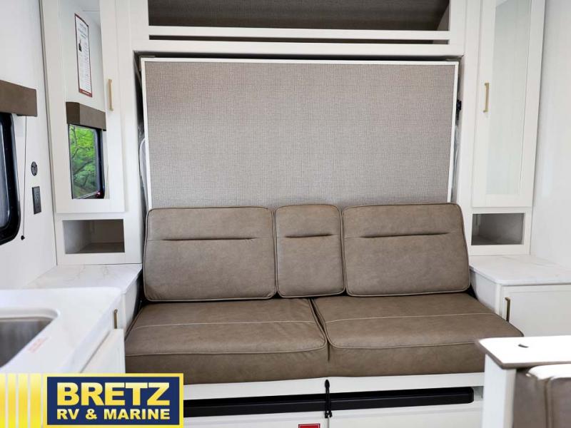 This is the perfect couple's trailer with versatile seating and sleeping space! You'll find a queen-size Murphy bed up front with storage space beside and above plus a full rear bath for added privacy. Once you've made lunch in the full kitchen, you can dine at the booth dinette or take your plate outdoors to sit under the 10' power awning. You'll also find pass-thru storage outside that will be perfect for fishing poles, lawn chairs, tools and more!