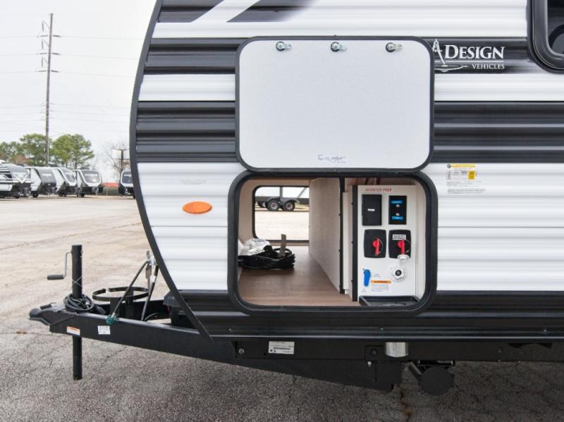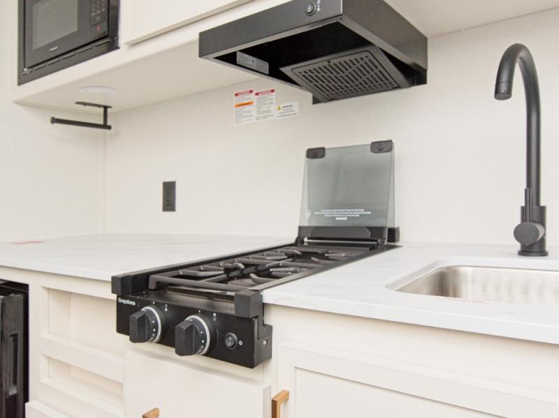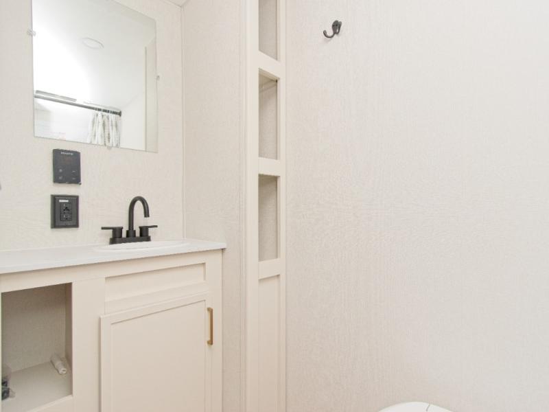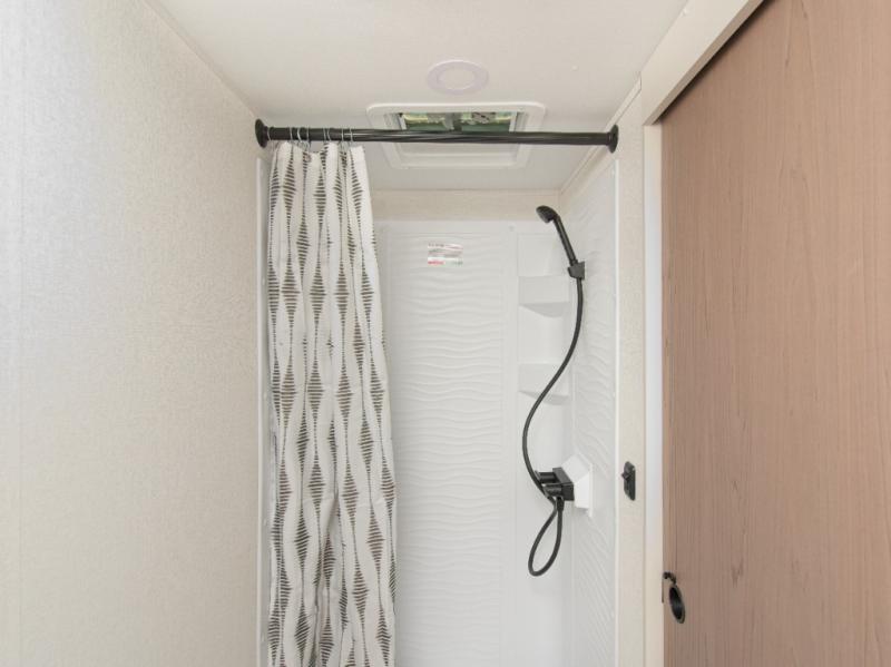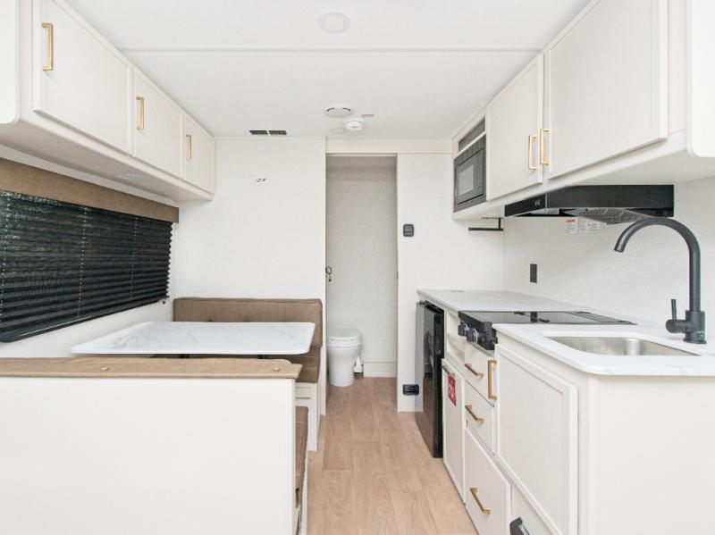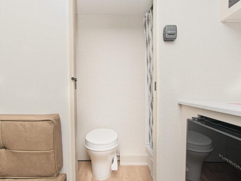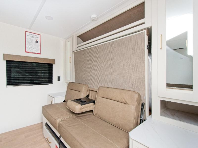 Up front, you’ll love the queen-size Murphy bed, which seamlessly converts to versatile living space during the day. Ample storage beside and above the bed keeps essentials organized and within reach. A full rear bathroom provides added privacy and residential comfort—perfect for extended trips or weekend getaways.