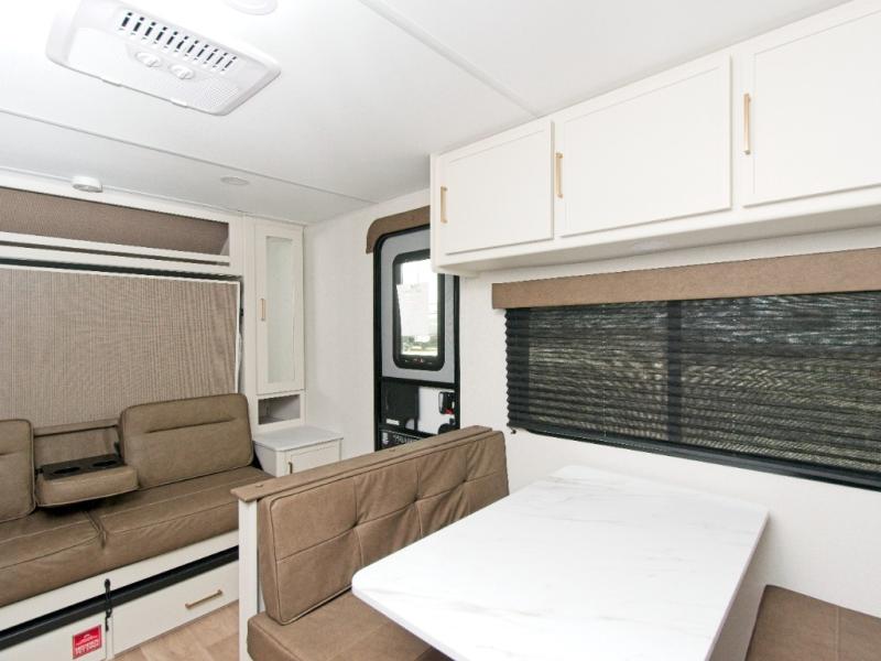Prepare meals effortlessly in the fully equipped kitchen, then enjoy your dining options inside at the booth dinette or outdoors beneath the 10' power awning. The exterior LP quick connect makes outdoor grilling simple, creating the perfect campsite cooking setup.