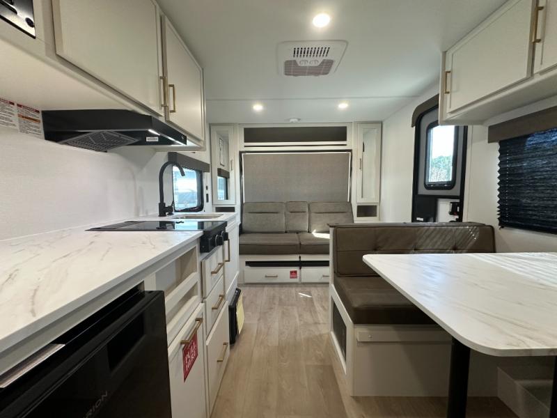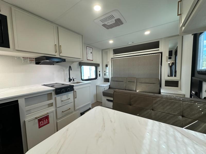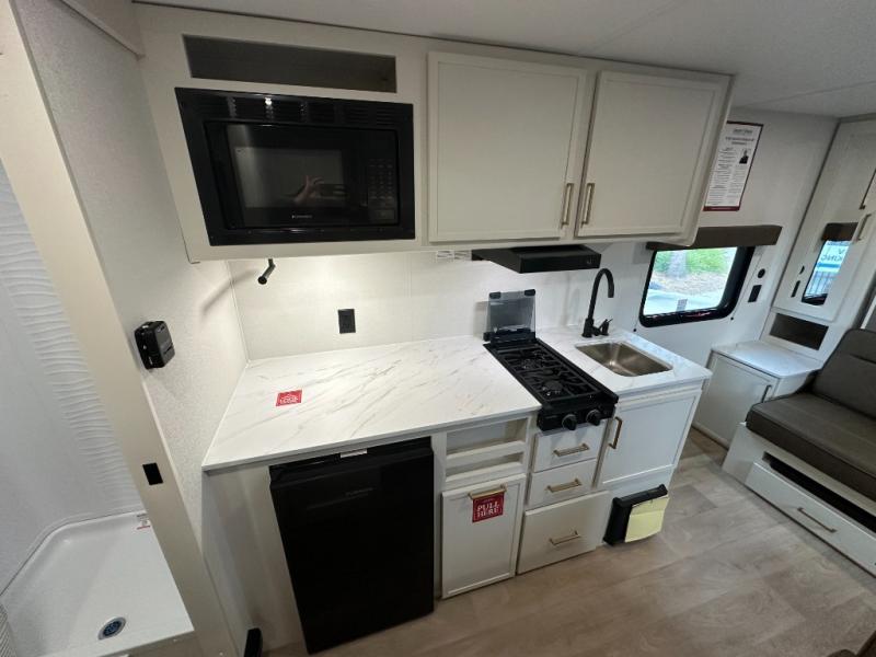 With any Transcend One travel trailer by Grand Design, you will enjoy lightweight towing thanks to their single-axle. There are many interior comforts to make camping easier than ever, such as recessed lighting, residential countertops, and a 6' 6" interior height. Each model is constructed with a heated and enclosed underbelly with suspended tanks, a moisture barrier floor enclosure, and Thermofoil over the roof and front cap for added protection. And a JBL sound system will let you listen to tunes as you visit under the power awning with a Fusion light!