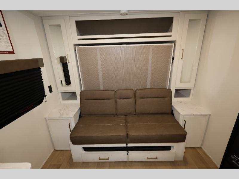 This is the perfect couple's trailer with versatile seating and sleeping space! You'll find a queen-size Murphy bed up front with storage space beside and above plus a full rear bath for added privacy. Once you've made lunch in the full kitchen, you can dine at the booth dinette or take your plate outdoors to sit under the 10' power awning. You'll also find pass-thru storage outside that will be perfect for fishing poles, lawn chairs, tools and more!