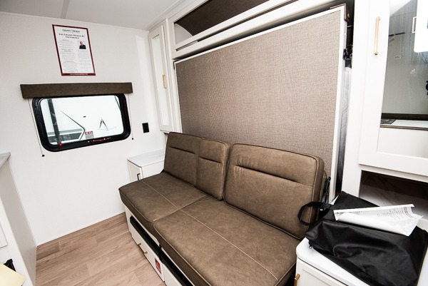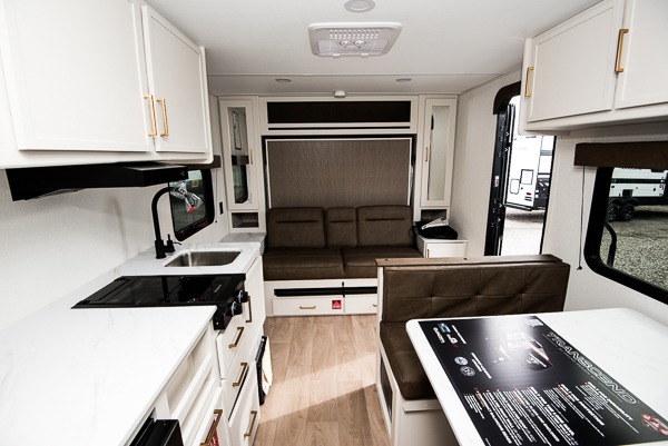 This is the perfect couple's trailer with versatile seating and sleeping space! You'll find a queen-size Murphy bed up front with storage space beside and above plus a full rear bath for added privacy. Once you've made lunch in the full kitchen, you can dine at the booth dinette or take your plate outdoors to sit under the 10' power awning. You'll also find pass-thru storage outside that will be perfect for fishing poles, lawn chairs, tools and more!
