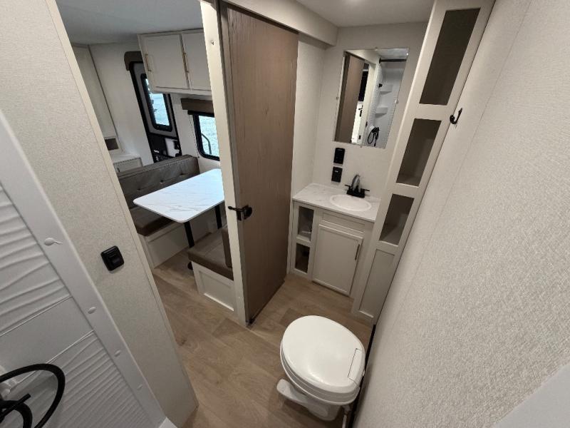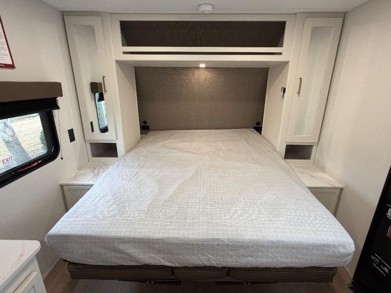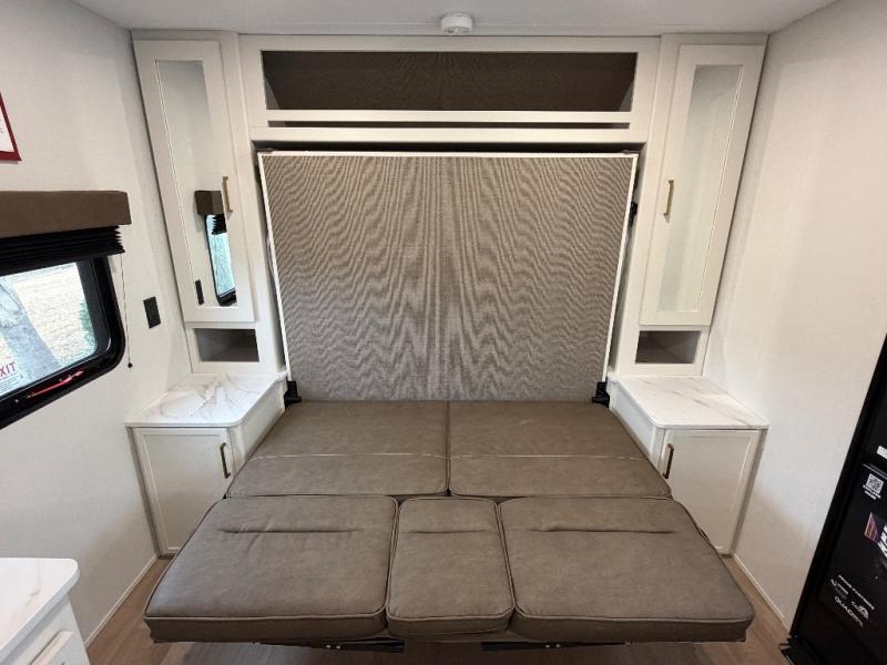 This is the perfect couple's trailer with versatile seating and sleeping space! You'll find a queen-size Murphy bed up front with storage space beside and above plus a full rear bath for added privacy. Once you've made lunch in the full kitchen, you can dine at the booth dinette or take your plate outdoors to sit under the 10' power awning. You'll also find pass-thru storage outside that will be perfect for fishing poles, lawn chairs, tools and more!