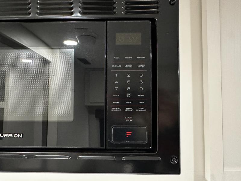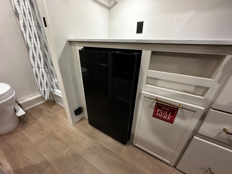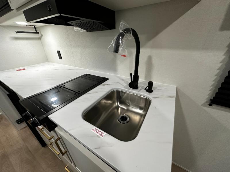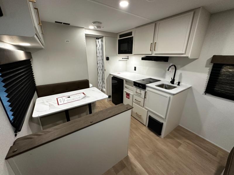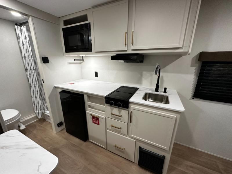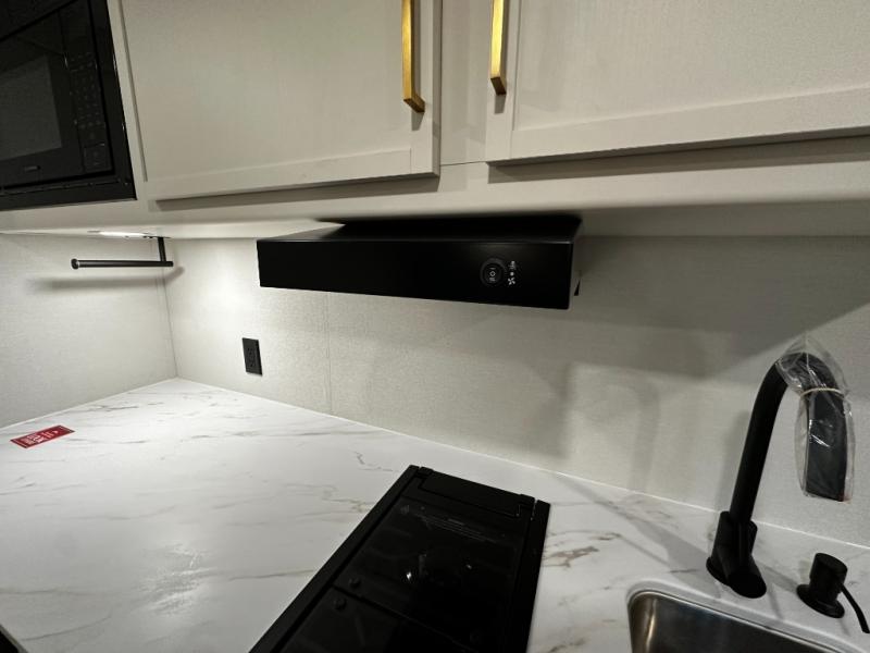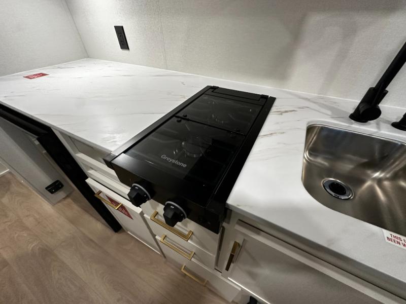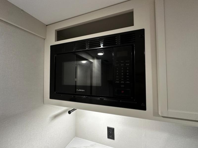 The kitchen is ready to handle everything from simple breakfasts to full camp-cooked dinners with a two-burner cooktop, microwave, and glass-front 12V refrigerator that brings both functionality and style to meal prep. Ample counter space and thoughtful storage keep your essentials organized and accessible.